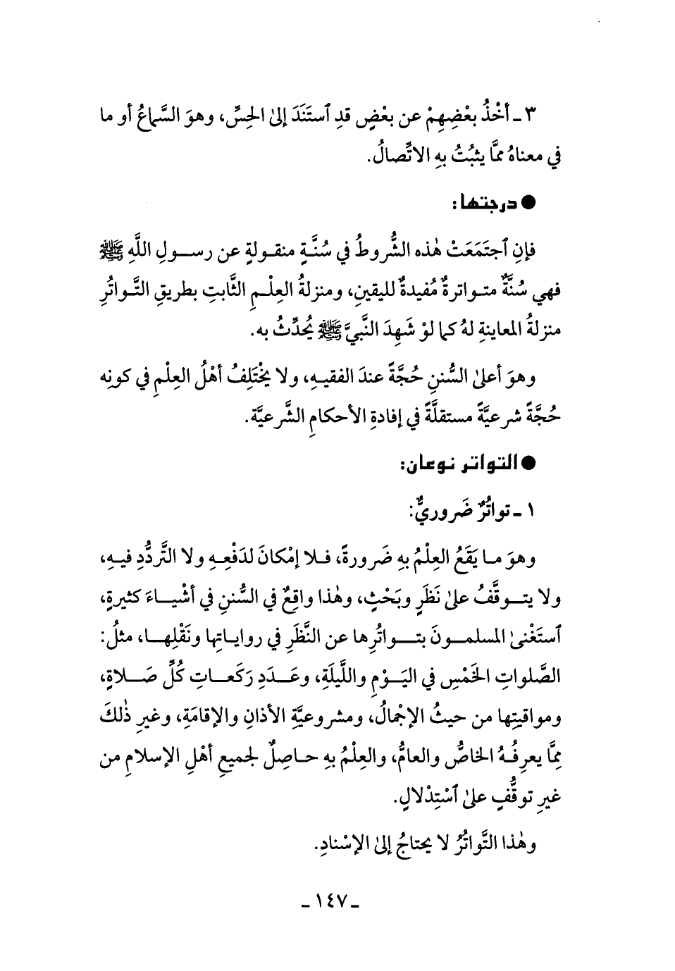 فإنِ اجتَمَعَتْ هذهِ الشُّروطُ في سُنَّةٍ منقولةٍ عن رسول الله - صلى الله عليه وسلم - فهيَ سُنَّةٌ متواترةٌ مفيدةٌ لليقينِ، ومنزلةُ العلمِ الثَّابتِ بطريقِ التَّواتُرِ منزلةُ المعاينةِ لهُ كما لو شَهِدَ النَّبيَّ - صلى الله عليه وسلم - يُحدِثُ بهِ.