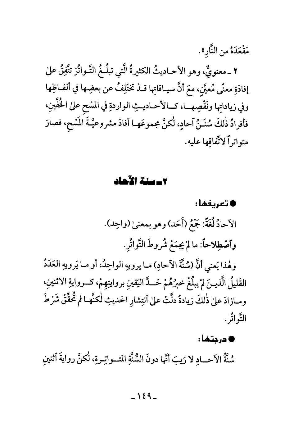 وهذا يعني أنَّ (سُنَّة الآحادِ) ما يرويهِ الواحدُ، أو ما يرويهِ العدَدُ القليلُ الَّذيمَ لم يبْلُغْ خبرُهُم حدَّ اليقينِ بروايتِهِمْ، كروايةِ الإثنينِ، وما زادَ على ذلكَ زيادَةً دلَّتْ على انتِشارِ الحديثِ لكنَّها لم تُحقِّقْ شرْطَ التَّواتُر.