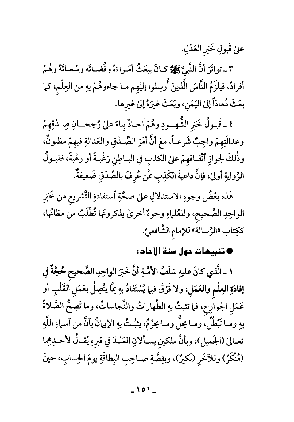 1ـ الَّذي كان عليه سلفُ الأُمَّةِ أنَّ خبر الواحدِ الصَّحيحِ حُجَّةٌ في إفادَةِ العلمِ والعملِ، ولا فرقَ فيمَا يُستفادُ به مِمَّا يتَّصلُ بعملِ القلبِ أو عمَلِ الجوَارِحِ، فما تثبتُ بهِ الطَّهاراتُ والنَّجاساتُ، وما تصحُّ الصَّلاةُ به وما تَبْطُلُ، وما يحلُّ وما يحرُمُ، يثبتُ به الإيمانُ بأنَّ من أسماء اللهِ تعالى (الجميل) ، وبأنَّ ملكينِ يسألانِ العبْدَ في قبرِهِ يُقالُ لأحدِهمَا (مُنكرٌ) وللآخرِ (نكيرٌ) ، وبقصَّةِ صاحبِ البِطَاقَةِ يومَ الحِسابِ، حينَ