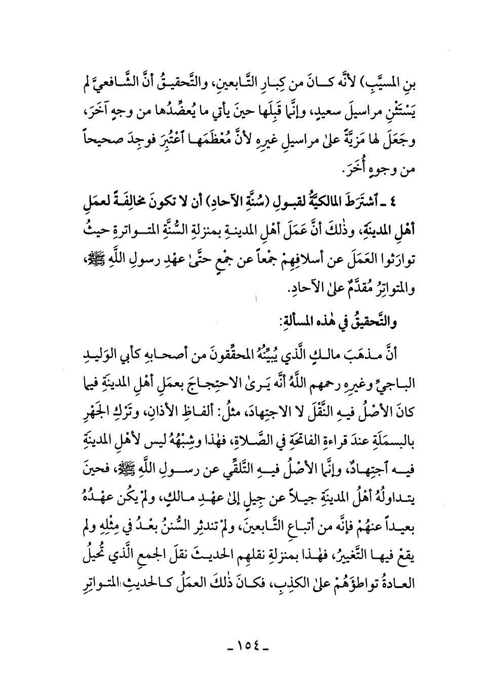 4ـ اشترطَ المالكيَّةُ لقبولِ (سُنَّةِ الآحادِ) أن لا تكونَ مخالفَةً لعملِ أهلِ المدينَةِ، وذلكَ أنَّ عملَ أهلِ المدينةِ بمنزلَةِ السُّنَّةِ المتواترَةِ حيثُ توارثُوا العملَ عن أسلافهِم جمعًا عن جمعٍ حتَّى عهدِ رسول الله - صلى الله عليه وسلم -، والمتواترُ مقَدَّمٌ على الآحادِ.
