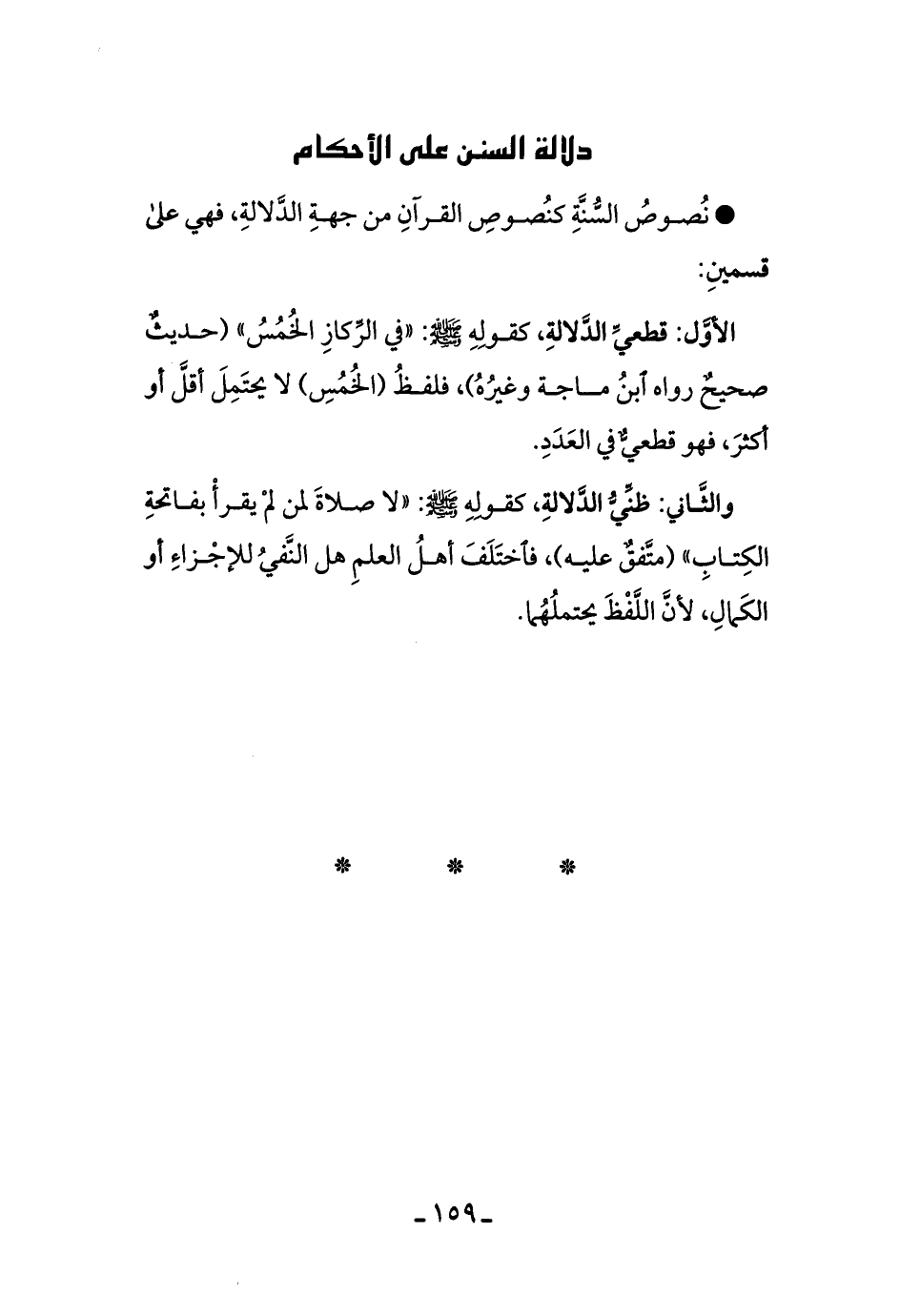 والثَّاني: ظنِّيُّ الدَّلالةِ، كقوله - صلى الله عليه وسلم -: ((لا صلاَةَ لمن لم يقرأْ بِفاتحَةِ الكتابِ)) [متفقٌ عليه] ، فاختلفَ أهلُ العلمِ هل النَّفيُ للإجزاءِ، أو الكمالِ، لأنَّ اللَّفظَ يحتملُهُمَا.