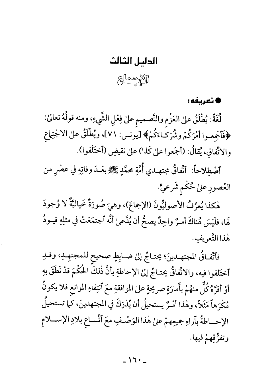 هكذا يُعرِّفُ الأصوليُّونَ (الإجماعَ) ، وهي صُورةٌ خياليَّةٌ لا وُجودَ لهاَ، فليسَ هُناكَ أمرٌ واحدٌ يصحُّ أن يُدَّعى أنَّهُ اجتمعَتْ في مثلهِ قيودُ هذا التَّعريفِ.