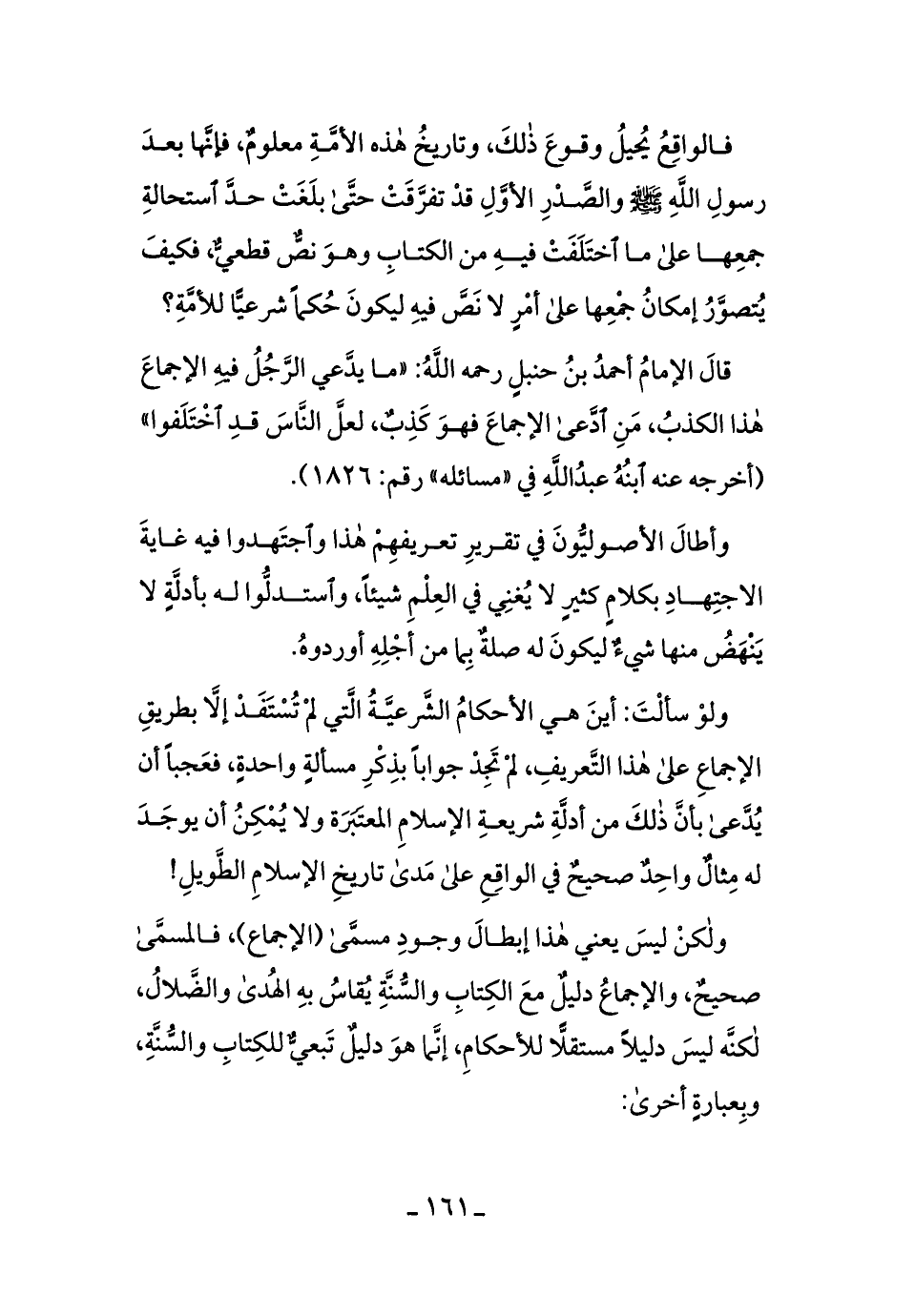 ولو سألتَ: أينَ هي الأحكامُ الشَّرعيَّةُ الَّتي لم تُستفَدْ إلاَّ بطريقِ الإجماعِ على هذا التَّعريفِ، لم تَجِدْ جوابًا بذِكرِ مسألةٍ واحدَةٍ، فعجبًا أن يُدَّعى بأنَّ ذلك من أدلَّةِ شريعةِ الإسلامِ المعتبَرَة ولايُمكنُ أن يوجدَ له مثالٌ واحدٌ صحيحٌ في الواقعِ على مدَى تاريخِ الإسلامِ الطَّويلِ!