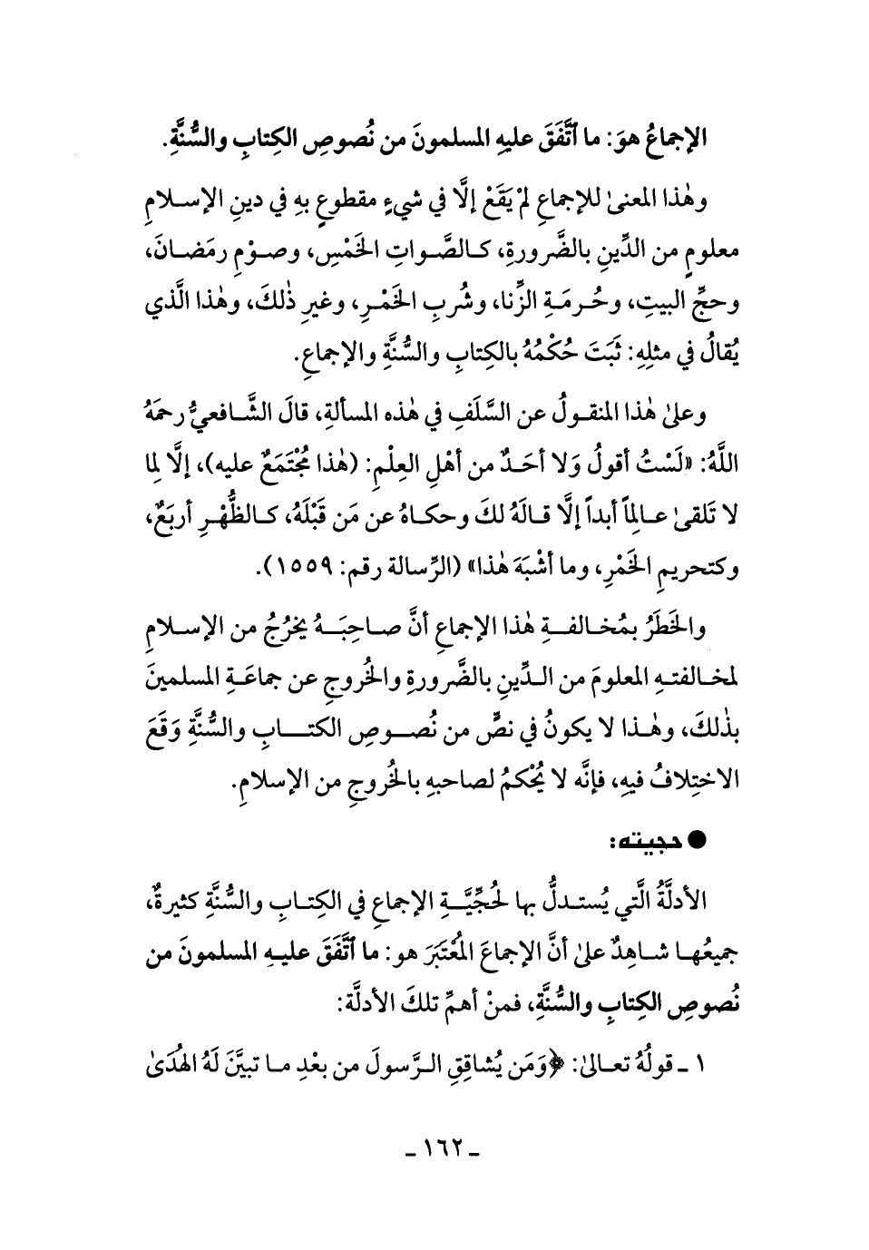 وعلى هذا المنقولُ عن السَّلفِ في هذه المسألةِ، قال الشَّافعيُّ رحمهُ الله: ((لستُ أقولُ ولا أحدٌ من أهل العلمِ: (هذا مُجتمعٌ عليه) ، إلاَّ لما لا تلقَى عالمًا أبدًا إلاَّ قالهُ لك وحكاهُ عن منْ قبلهُ، كالظُّهرِ أربعٌ، وكتحريمِ الخمرِ، وما أشبهَ هذا)) [الرِّسالة رقم: 1559] .
