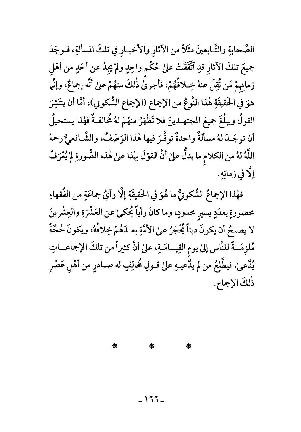 فهذا الإجماعُ السُّكوتِيُّ ما هوَ في الحقيقةِ إلاَّ رأيُ جماعةٍ من الفقهاءِ محصورَةٍ بعددٍ يسيرٍ محدودٍ، وما كانَ رأيًا يُحكَى عن العشْرَةِ والعِشرينَ لا يصلحُ أن يكونَ دينًا يُحجرُ على الأمَّةِ بعدَهُم خلافُهُ، ويكونَ حُجَّةً مُلزمَةً للنَّاسِ إلى يومِ القيامَةِ، على أنَّ كثيرًا من تلك الإجماعاتِ يُدَّعلا، فيطَّلعُ من لم يدَّعيهِ على قولٍ مخالفٍ له صادرٍ من أهلِ عصرِ ذلكَ الإجماع.