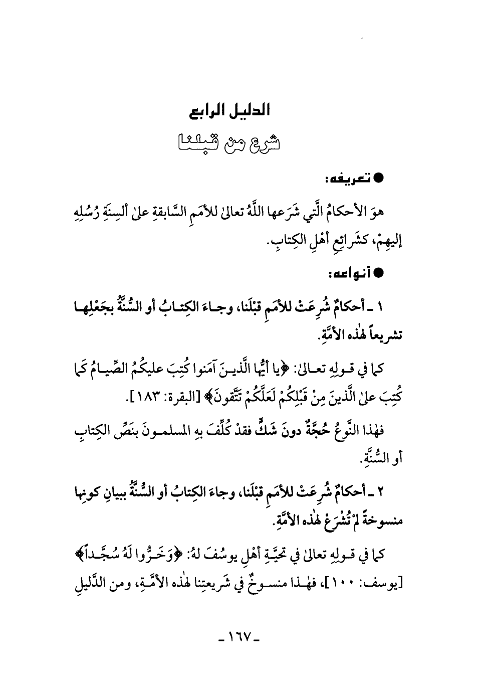 1ـ أحكامٌ شُرعتْ للأُممِ قبلَنا، وجاءَ الكتابُ أو السُّنَّةُ بجعْلهَا تشريعًا لهذه الأمَّةِ.