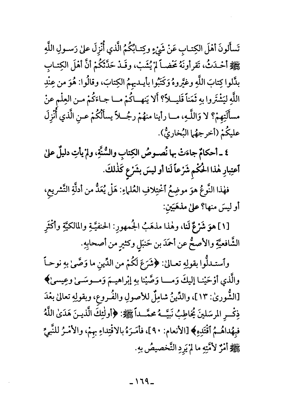 [1] هو شرعٌ لنا، وهذا مذهبُ الجمهورِ: الحنفيَّةِ والمالكيَّةِ وأكثرِ الشَّافعيَّةِ والأصحُّ عن أحمدَ بن حنبلٍ وكثيرٍ من أصحابهِ.