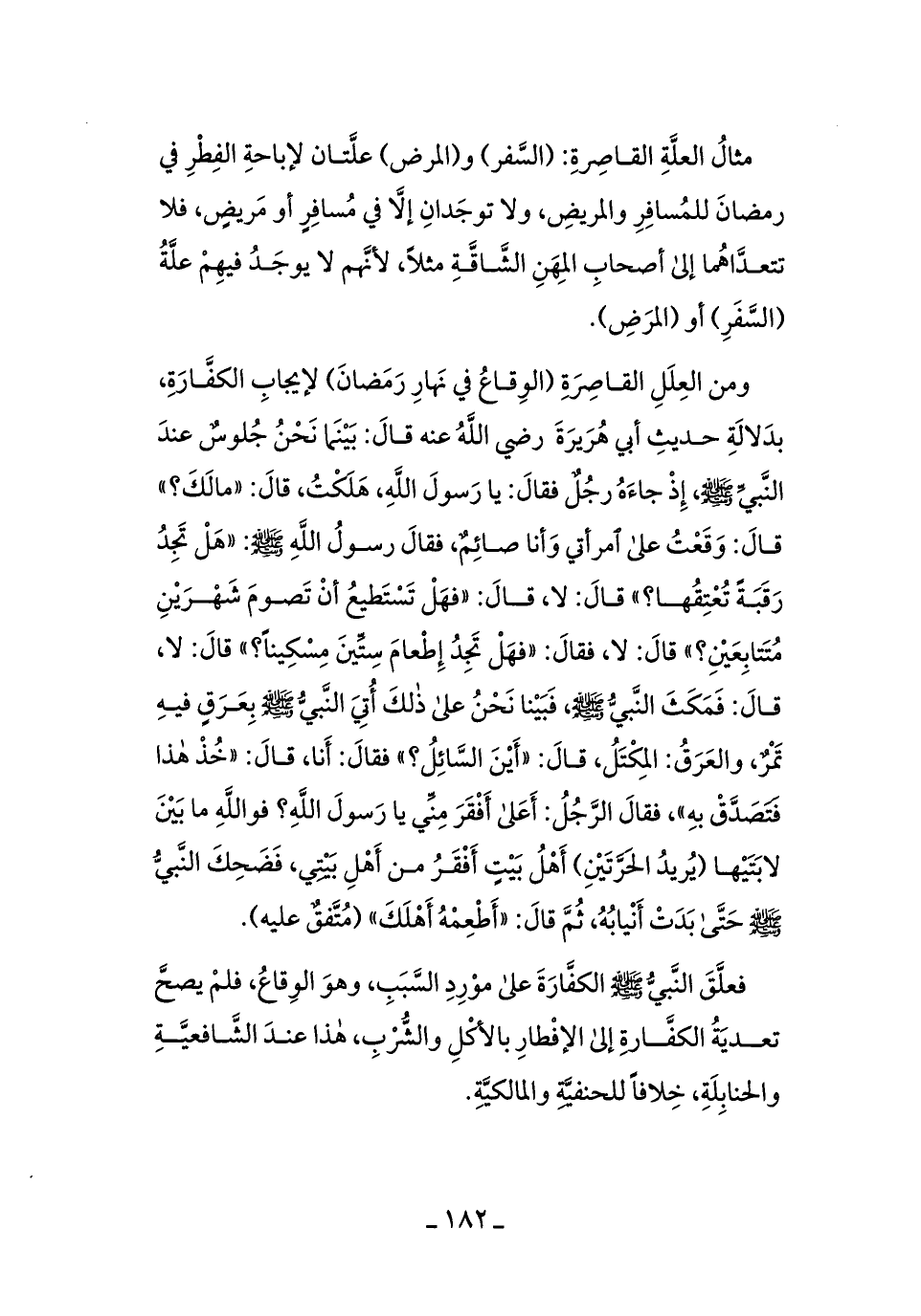 ومن العللِ القاصرَةِ (الوِقاعُ في نهارِ رمضانَ) لإيجابِ الكفَّارَةِ، بدلالةِ حديثِ أبي هريرَةَ رضي الله عنه قالَ: بينمَا نحنُ جلوسُ عندَ النَّبيِّ - صلى الله عليه وسلم -، إذْ جاءَهُ رجلٌ فقالَ: يا رسول الله، هلكتُ، قالَ: ((مَا لكَ؟)) قال: وقعتُ على امرأتِي وأنا صائمٌ، فقال رسول الله - صلى الله عليه وسلم -: ((هلْ تجدُ رقبةً تُعتِقُهَا؟)) قال: لا، قال: ((فهلْ تستطيعُ أن تصومَ شَهرينِ مُتتابِعينِ؟)) قالَ لاَ، فقال: ((فهلْ تجدُ إطعامَ ستيِّنَ مسكينًا؟)) قال: لاَ، قالَ فمكثَ النَّبيُّ - صلى الله عليه وسلم -، فبينَا نحنُ على ذلكَ أُتِي النَّبيُّ - صلى الله عليه وسلم - بعرَقٍ فيه تمرٌ، والعرقُ: المِكتلَُ، قالَ: ((أينَ السَّائلُ؟)) فقالَ: أنَا، قالَ: ((خُذ هذا فتصدَّقْ بهِ)) ، فقالَ الرَّجلُ: أعلَى أفْقرَ منِّي يا رسول الله؟ فواللهِ ما بينَ لابتَيْهَا (يُريدُ الحرَّتينِ) أهلُ بيتٍ أفقرُ من أهلِ بيْتِي، فضَحكَ النَّبيُّ - صلى الله عليه وسلم - حتَّى بدَتْ أنيابُهُ، ثمَّ قالَ: ((أطْعمُهُ أهلكَ)) [متفقٌ عليه] .
