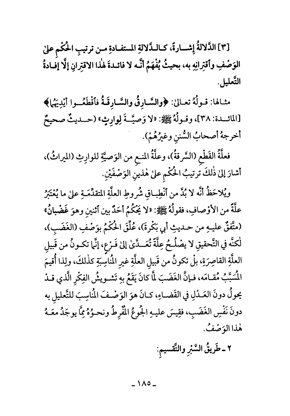 ويُلاحظُ أنَّهُ لا بدَّ من انطِباقِ شُروطِ العلَّةِ المتقدِّمةِ على ما يُعتبرُ علَّةً من الأوصافِ، فقوله - صلى الله عليه وسلم -: ((لا يَحكمُ أحدٌ بين اثنينِ وهو غضبانُ)) [متفقٌ عليه من حديث أبي بكرة] ، علِّق الحُكم بوصفِ (الغضبِ) ، لكنَّهُ في التَّحقيقِ لا يصلُحُ علَّةً تُعدَّى إلى فرعٍ، إنَّما تكونُ من قبيلِ العلَّةِ القاصرَةِ، بلْ تكونُ من قبيلِ العلَّةِ غير المُناسبَةِ كذلكَ، ولذا أُقيمَ المُسبَّبُ مُقامه، فإنَّ الغضبَ لمَّا كانَ يقعُ به تشويشُ الفكرِ الَّذي قد يحولُ دونَ العدْلِ في القضاءِ، كانَ هو الوصفَ المُناسبَ للتَّعليلِ به دونَ نفسِ الغضبِ، فقيسَ عليه الجُوعُ المُفرِطُ ونحوُهُ ممَّا يُوجدُ معهُ هذا الوصفُ.