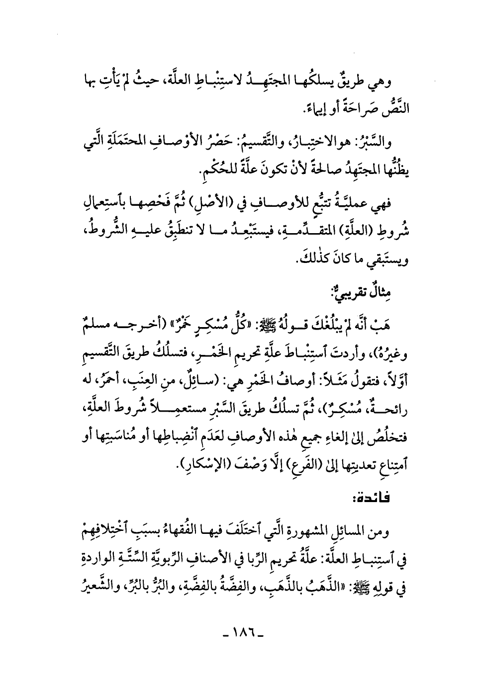 هبْ أنَّه لم يبلُغْكَ قوله - صلى الله عليه وسلم -: ((كلُّ مِسكرٍ خَمرٌ)) [أخرجه مسلمٌ وغيره] ، وأردتَ استنباطَ علَّةِ تحريمِ الخمرِ، فتسلُكُ طريقَ التَّقسيمِ أوَّلاً، فتقولُ مثلاً: أوصافُ الخمرِ هيَ: (سائلٌ، من العنبِ، أحمرُ، لهُ رائحةٌ، مسكرٌ) ثمَّ تسلكُ طريقَ السَّبرِ مستعملاً شُروطَ العلَّةِ، فتخلُصُ إلى إلغاءِ جميع هذهِ الأوصافِ لعدَمِ انضِباطِها أو مُناسَبَتِها أو امتناعِ تعديتِهَا إلى (الفرعِ) إلاَّ وصفَ (الإسكار) .