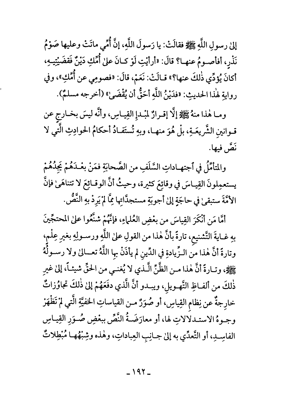 وما هذا منهُ إلاَّ إقرارٌ لمبدإِ القياسِ، وأنَّهُ ليسَ بخارِجٍ عن قوانين الشَّريعةِ، بلْ هوَ منهَا، وبهِ تُستفادُ أحكامُ الحوادثِ الَّتي لا نصَّ فيها.