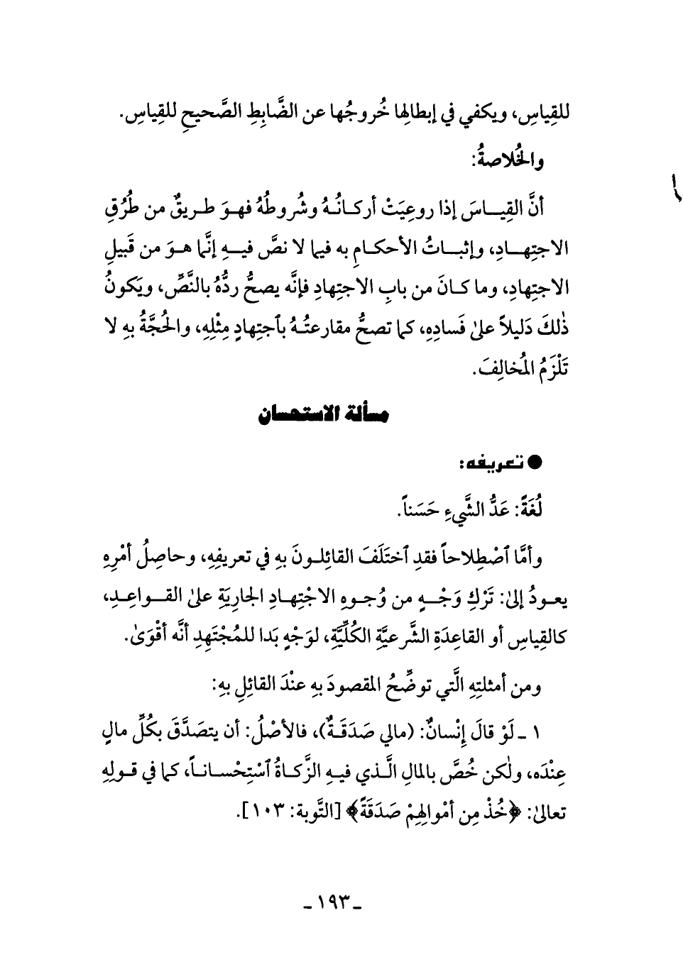 1ـ لو قالَ إنسانٌ: (مالي صدَقَةٌ) ، فالأصلُ: أن يتصدَّقَ بكلِّ مالٍ عندَهُ، ولكنْ خصَّ بالمالِ الَّذي فيه الزَّكاةُ استِحسانًا، كما في قوله تعالى: {خُذْ مِنْ أَمْوَالِهِمْ صَدَقَةً} [التوبة: 103] .