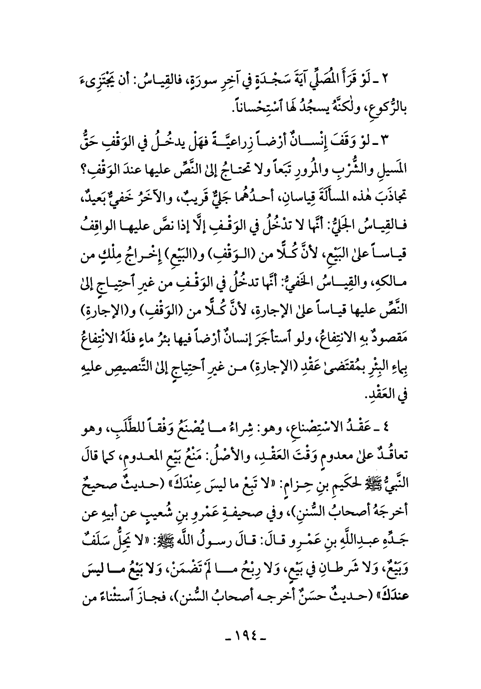 4ـ عقدُ الاستِصناعِ، وهوَ: شراءُ ما يُصنعُ وقفًا للطَّلبِ، وهو تعاقُّدٌ على معدومٍ وقتَ العقدِ، والأصلُ: منعُ بيعِ المعدومِ، كما قال النَّبيُّ - صلى الله عليه وسلم - لحكيمِ بن حِزامٍ: ((لا تبعْ ما ليسَ عندَكَ)) [حديثٌ صحيحٌ أخرجه أصحابُ السُّننِ] ، وفي صحيفة عمرِو بن شُعيبٍ عن أبيه عن جدِّه عبد الله بن عمرِو قالَ: قال رسول الله - صلى الله عليه وسلم -: ((لا يحلُّ سلفٌ وبيعٌ، ولا شرطانِ في بيعٍ، ولا رِبحُ ما لم تضمَنْ، ولا بيعُ ما ليسَ عندكَ)) [حديثٌ حسنٌ صحيحٌ أخرجه أصحاب السُّننِ] ، فجازَ استثناء من
