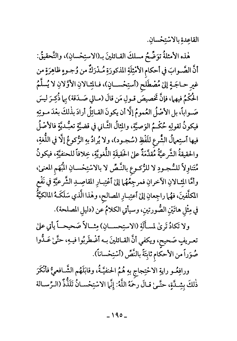 هذه الأمثلة توضِّحُ مسلكَ القائلينَ بـ (الاستِحسانِ) ، والتَّحقيقُ: أنّ الصواب في أحكامِ الأمثلة المذكورةِ مُدركٌ من وجوهٍِ ظاهرةٍ من غير حاجةٍ إلى مصطلح (استِحسانِ) فالمثالانِ الأوَّلانِ لا يُسلَّم الحكم فيهما، فإنَّ تخصيصَ قول من قال (مالي صدقة) بما ذُكر ليسَ صوابًا، بل الأصلُ العمُومُ إلاَّ أن يكونَ القائلُ أراد بذلكَ بعدَ موتِهِ فيكونُ لقولهِ حُكمُ الوصيَّةِ، والمثالُ الثَّاني في قضيَّةٍ فالأصلُ فيها استعمالُ الشَّرعِ للفْظِ (سُجود) ، ولا يُرادُ به الرُّكوعُ إلاَّ في اللُّغةِ، والحقيقةُ الشَّرعيَّةُمقدَّمةٌ على الحقيقةِ اللُّغويَّةِ، خلافًا للحنفيَّةِ، فيكونُ مُتناولاً للسُّجودِ لا للرُّكوعِ بالنَّصِّ لا بالاستحسانِ المُبهمِ المعنى، وأمَّا المثالانِ الآخرانِ فمرجِعُهما إلى اعتبارِ المقاصِدِ الشَّرعيَّةِ في نفعِ المكلَّفينَ فهُما راجعانِ إلى اعتبارِ المصالحِ، وهذا الَّذي سلكَهُ المالكيَّةُ في مثلِ هاتينِ الصُّورتينِ، وسيأتي الكلامُ عن (دليل المصلحة) .