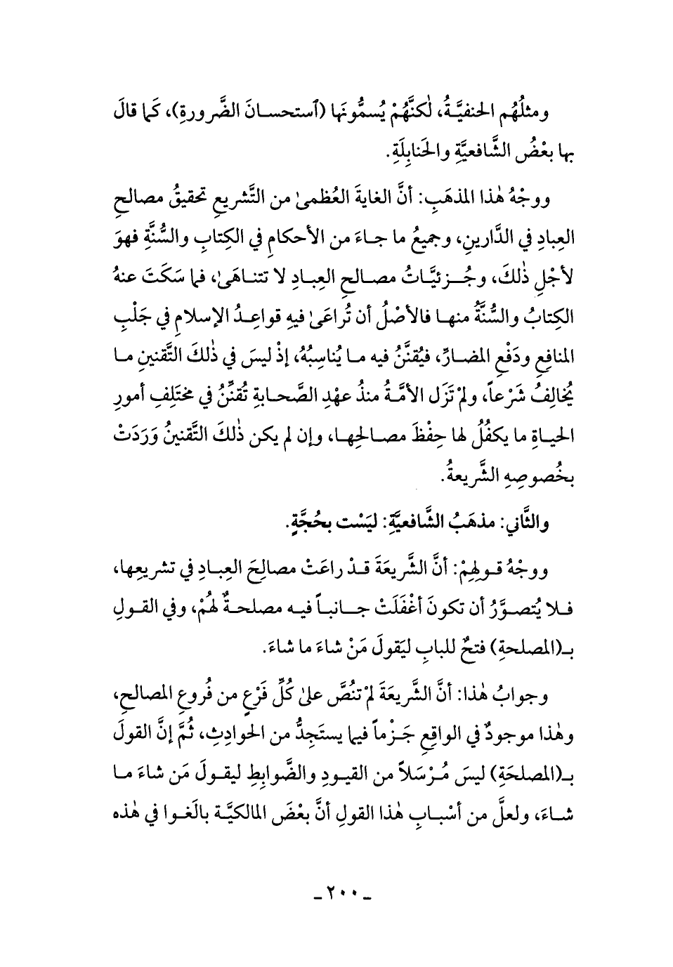ووجهُ قولهِم: أنَّ الشَّريعةَ قدْ راعتْ مصالحَ العبادِ في تشريعهَا، فلا يُتصوَّرُ أن تكونَ أغْفلتْ جانبًا فيه مصلحةٌ لهُمْ، وفي القول بـ (المصلحةِ) فتحٌ للبابِ ليقولَ من شاءَ ما شاءَ.