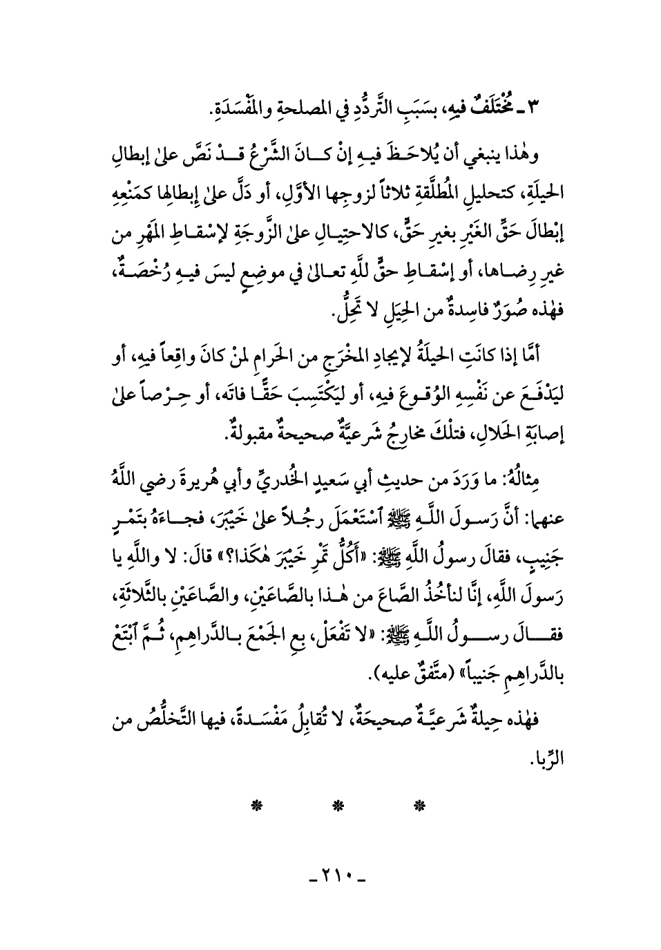 مثالهُ: ما وردَ من حديثِ أبي سعيدٍ الخُدريِّ وأبي هريرَةَ رضي الله عنهمَا: أنَّ رسول الله - صلى الله عليه وسلم - استَعملَ رجلاً على خيبرَ، فجاءَهُ بتمرٍ جنيبٍ، فقالَ رسول الله - صلى الله عليه وسلم -: ((أكلُّ تمرِ خيبرَ هكَذَا؟)) قال: لا واللهِ يا رسول الله، إنَّا لنأخذُ الصَّاع من هذا بالصَّاعينِ، والصَّاعينِ بالثَّلاثة، فقال رسول الله - صلى الله عليه وسلم -: ((لا تفعلْ، بِعْ الجمعَ بالدَّراهم، ثمَّ ابتعْ بالدَّارهمِ جنيبًا)) [متفقٌ عليه] .