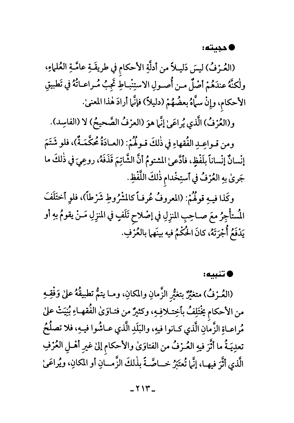(العُرفُ) ليسَ دليلاً من أدلَّةِ الأحكامِ في طريقةِ عامَّةِ العلماءِ، ولكنَّهُ عندَهُم أصلٌ من أُصولِ الاستِنباطِ تجبُ مُراعَاتُهُ في تطبيقِ الأحكامِ، وإن سماهُ بعضُهُم (دليلاً) فإنَّما أرادَ هَذا المعنى.
