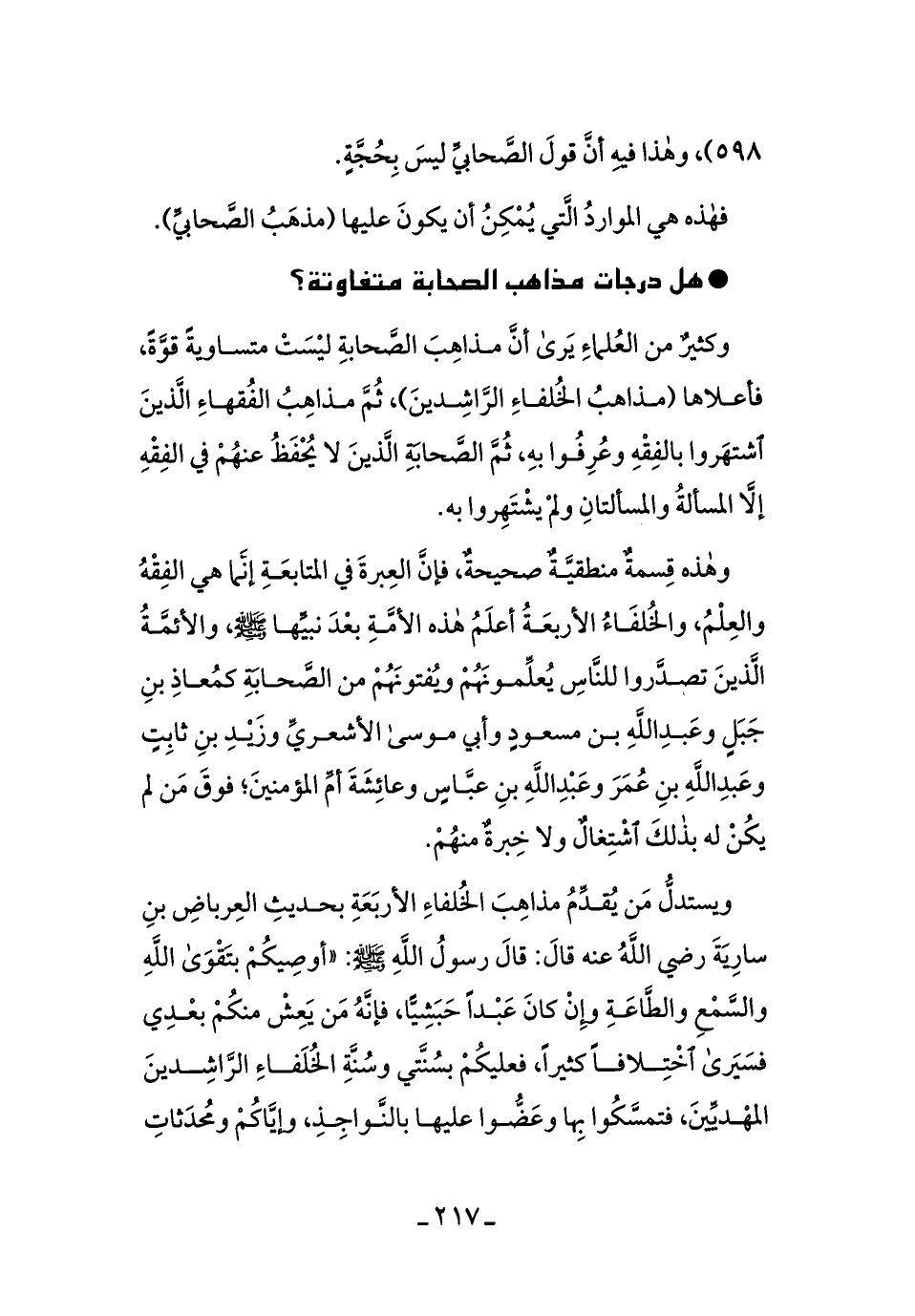 ويستدلُّ من يُقدِّم مذاهبَ الخُلفاءِ الأربعةِ بحديث العرباضِ بنِ ساريَةَ رضي الله عنهُ قالَ: قال رسول الله - صلى الله عليه وسلم -: ((أوصيكمْ بتقوى اللهِ والسَّمعِ والطَّاعة وإنْ كانَ عبدًا حبشيًّا، فإنَّهُ من يعِشْ منكُم بعدِي فسيرَى اختلافًا كثيرًا، فعليكمْ بسُنَّتي وسنَّةِ الخُلفاءِ الرَّاشِدينَ المهْدِيِّينَ فتمسَّكُوا بها وعضُّوا عليها بالنَّواجِذِ، وإيَّاكُم ومُحدثَاتِ