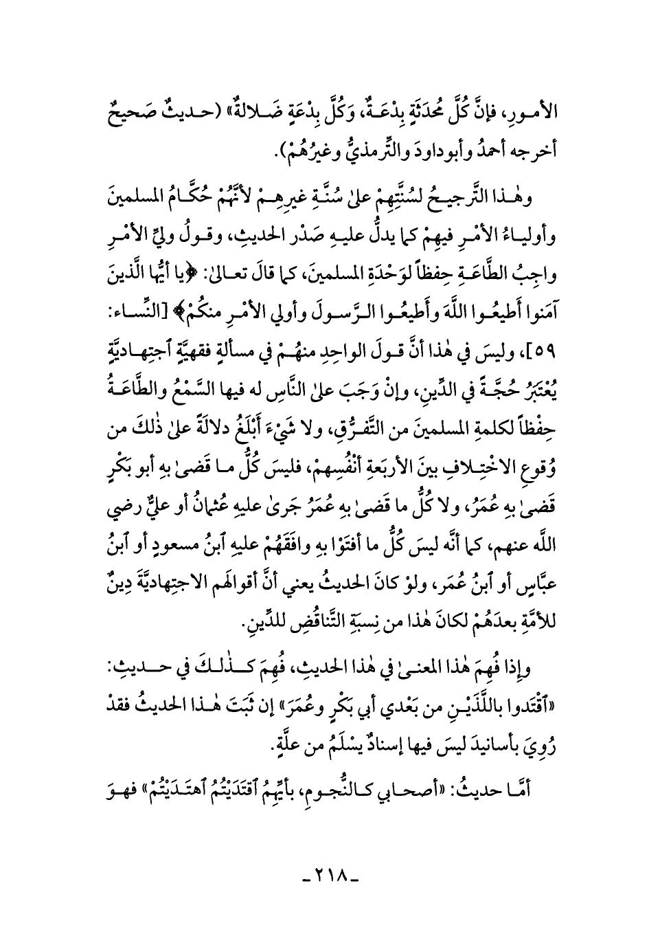 وهذا التَّرجيحُ لسُنَّتهم على سُنَّة غيرهم لأنَّهم حُكَّام المسلمين وأولياءُ الأمرِ فيهم كما يدلُّ عليه صدرِ الحديثِ، وقولُ وليِّ الأمرِ واجبُ الطَّاعةِ حفظًا لوحدَةِ المسلمين، كما قال تعالى: {يَا أَيُّهَا الَّذِينَ آَمَنُوا أَطِيعُوا اللَّهَ وَأَطِيعُوا الرَّسُولَ وَأُولِي الْأَمْرِ مِنْكُمْ} [النساء: 59] ، وليسَ في هذا أنَّ قول الواحدِ منهُم في مسألةٍ فقهيَّةٍ اجتهاديَّةٍ يُعتبرُ حجَّةً في الدِّين، وإن وجبَ على النَّاسِ له فيها السَّمعُ والطَّاعة حفظًا لكلمةِ المسلمين من التَّفرُّقِ، ولا شيء أبلغُ دلالةً على ذلك من وقوعِ الاختلافِ بين الأربعةِ أنفُسهم، فليسَ كلُّ ما قضى به أبوبكر قضى بهِ عُمرُ، ولا كُّلُّ ما قضى به عُمرُ جرى عليه عثمان أو عليُّ رضي الله عنهم، كما أنَّه ليسَ كلُّ ما أفتَوا به وافقهُم عليه ابن مسعودٍ أو ابنُ عبَّاسٍ أو ابنُ عمرَ، ولو كانَ الحديثُ يعني أنَّ أقوالهُم الاجتهاديَّةَ دينٌ للأمَّةِ بعدَهٌم لكانَ هذا من نسبةِ التَّناقُضِ للدِّينِ.