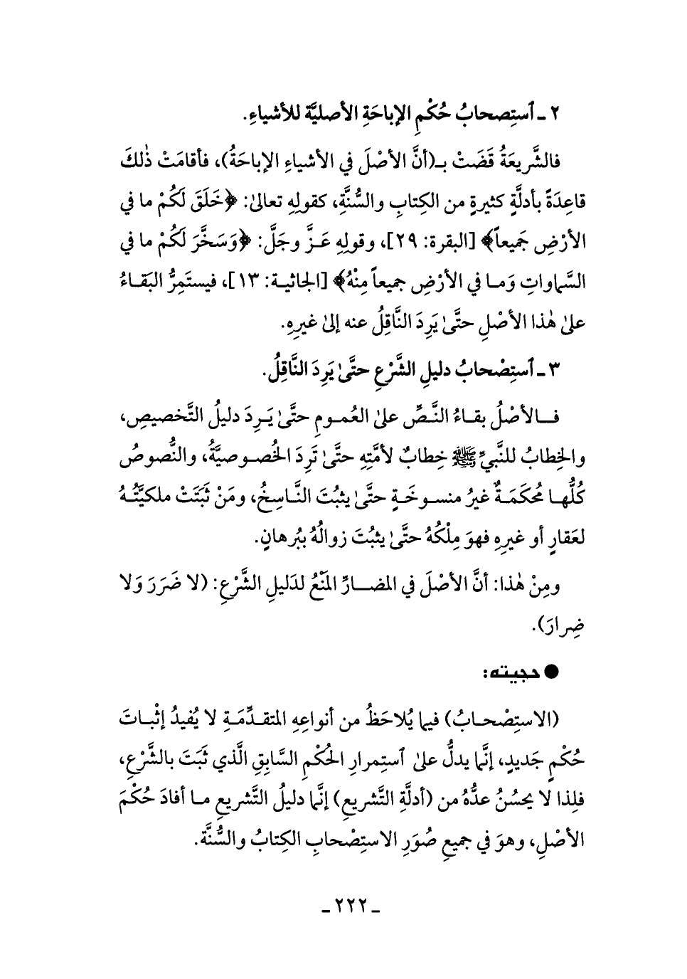 فالأصلُ بقاءُ النَّصِّ على العُمومِ حتَّى يرِدَ دليلُ التَّخصيصِ، والخطابُ للنَّبيِّ - صلى الله عليه وسلم - خطابٌ لأمَّتِهِ حتَّى ترِدَ الخُصوصَيَّةُ، والنُّصُوصُ كلُّها مُحكَّمةٌ غيرُ منسوخَةٍ حتَّى يثبُتَ النَّاسِخُ، ومن ثبَتَتْ ملكيَّتُهُ لعقارٍ أو غيرِهِ فهوَ مِلكُه حتَّى يثبُتَ زَوالُه بِبُرهانٍ.