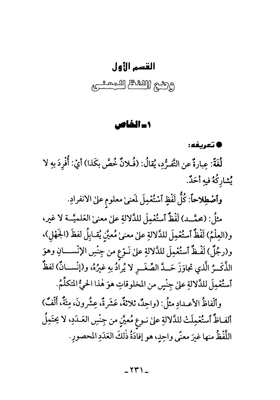 وألفاظُ الأعدادِ مثلُ: (واحدٌ، ثلاثةٌ، عشرَةٌ، عشرونَ، مئَةٌ، ألفٌ) ألفاظٌ استُعملَتْ للدَّلالةِ على نوعٍ معيَّنٍ من جنسِ العدَدِ، لا يحتملُ اللَّفظُ منها غير معنًى واحدٍ، هوَ إفادَةُ ذلكَ العدَدِ المحصُورِ.