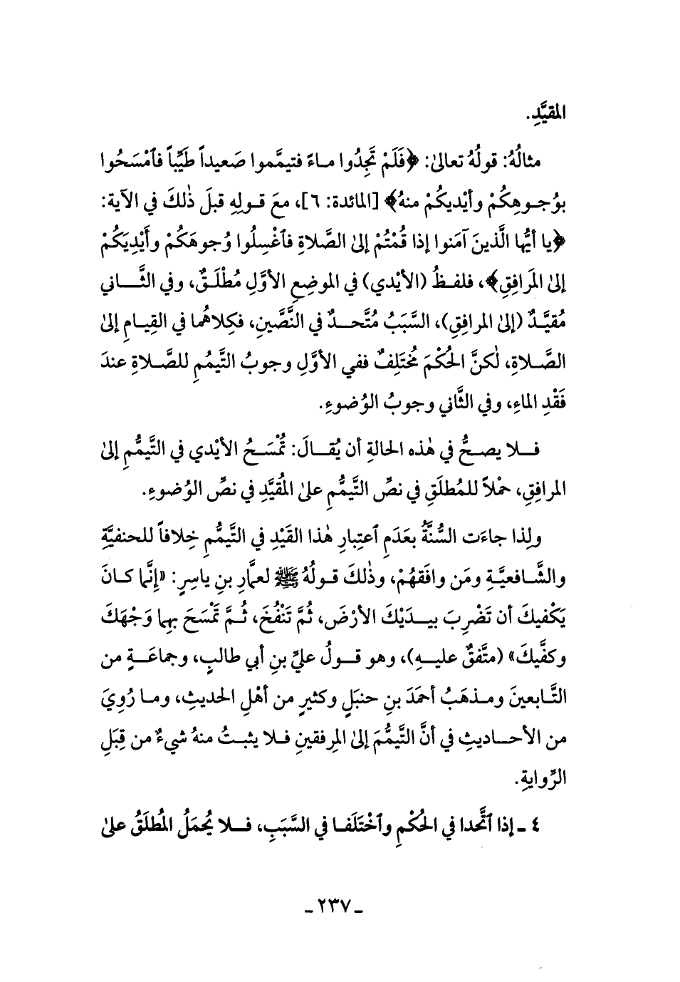 ولذَا جاءَت السُّنَّةُ بعَدمِ اعتبارِهَا هذا القيد ِفي التَّيمُّمِ خلافًا للحنفيَّةِ والشَّافعيَّة ومن وافقهُم، وذلكَ قوله - صلى الله عليه وسلم - لعمَّارِ بن ياسرٍ: ((إنَّما كان يكفيكَ أن تضربَ بيدَيكَ الأرضَ، ثمَّ تَنفُخَ، ثمَّ تمسَحَ بهمَا وجهَكَ وكفَّيكَ)) [متفقٌ عليه] ، وهو قولُ عليِّ بن أبي طالبٍ، وجماعةٍ من التَّابعينَ ومذهبُ أحمدَ بنِ حنبلٍ وكثيرٍ من أهلِ الحديثِ، وما رُويَ من الأحاديثِ في أنَّ التَّيمُمَ إلى المِرفقينِ فلا يثبُتُ منهُ شيءٌ من قِبِلِ الرِّوايةِ.