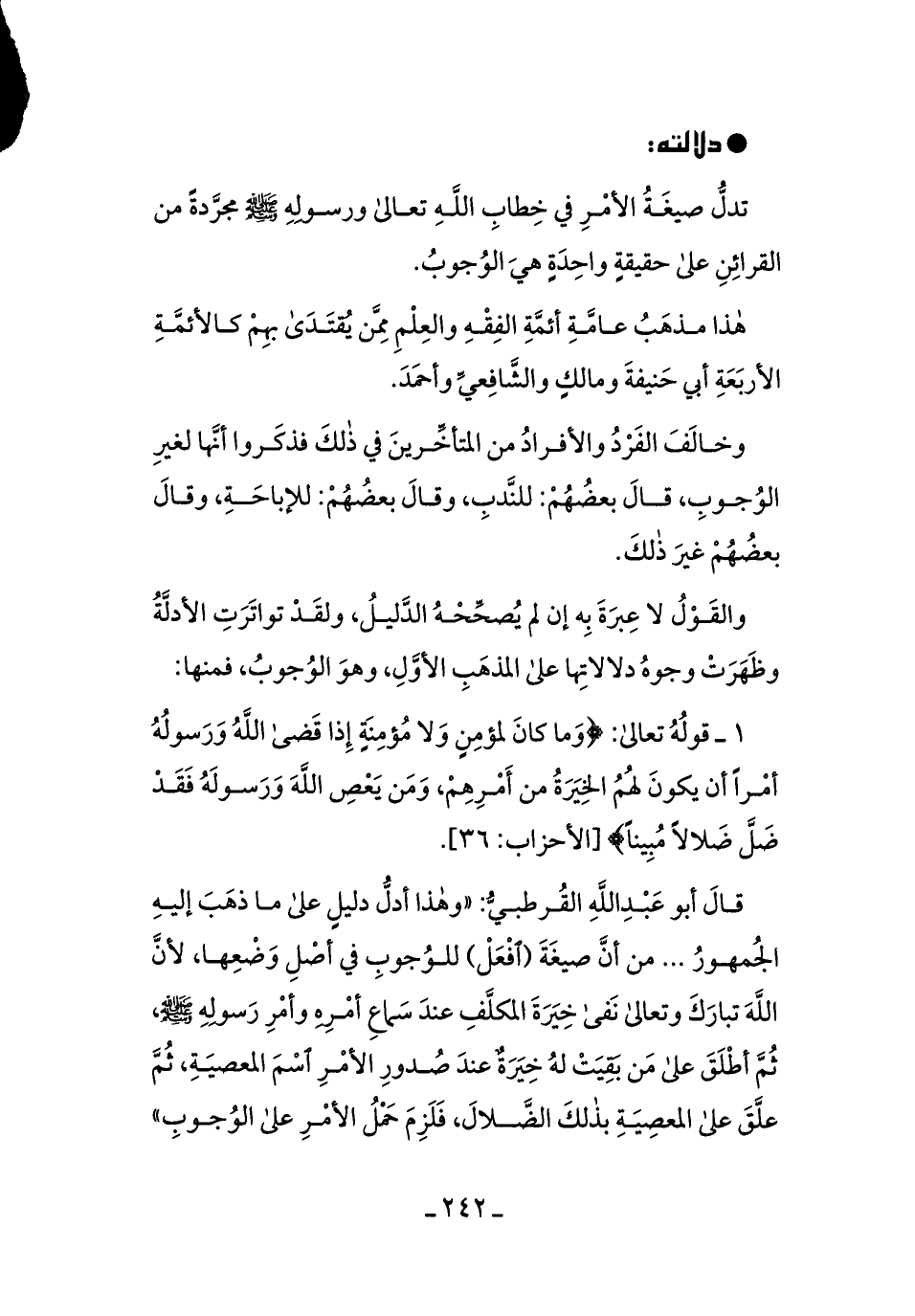 قال أبُوعبد الله القُرطبيُّ: ((وهذا أدُّ دليلٍ على ما ذهبَ إليه الجمهُورُ..من أنَّ صيغَةَ (افعلْ) للُوجوبِ في أصلِ وضعِهَا، لأنَّ الله تبارك وتعالى نفى خِيرَةَ المكلَّفِ عند سماعِ أمرِهِ وأمرِ رسوله - صلى الله عليه وسلم -، ثمَّ أطلقَ على من بقيتْ له خِيرَةٌ عندَ صُدورِ الأمرِ اسمَ المعصيَّةِ، ثمَّ علَّق على المعصيةِ بذلكَ الضَّلالِ، فلزِمَ حملُ الأمرِ على الوُجوبِ))