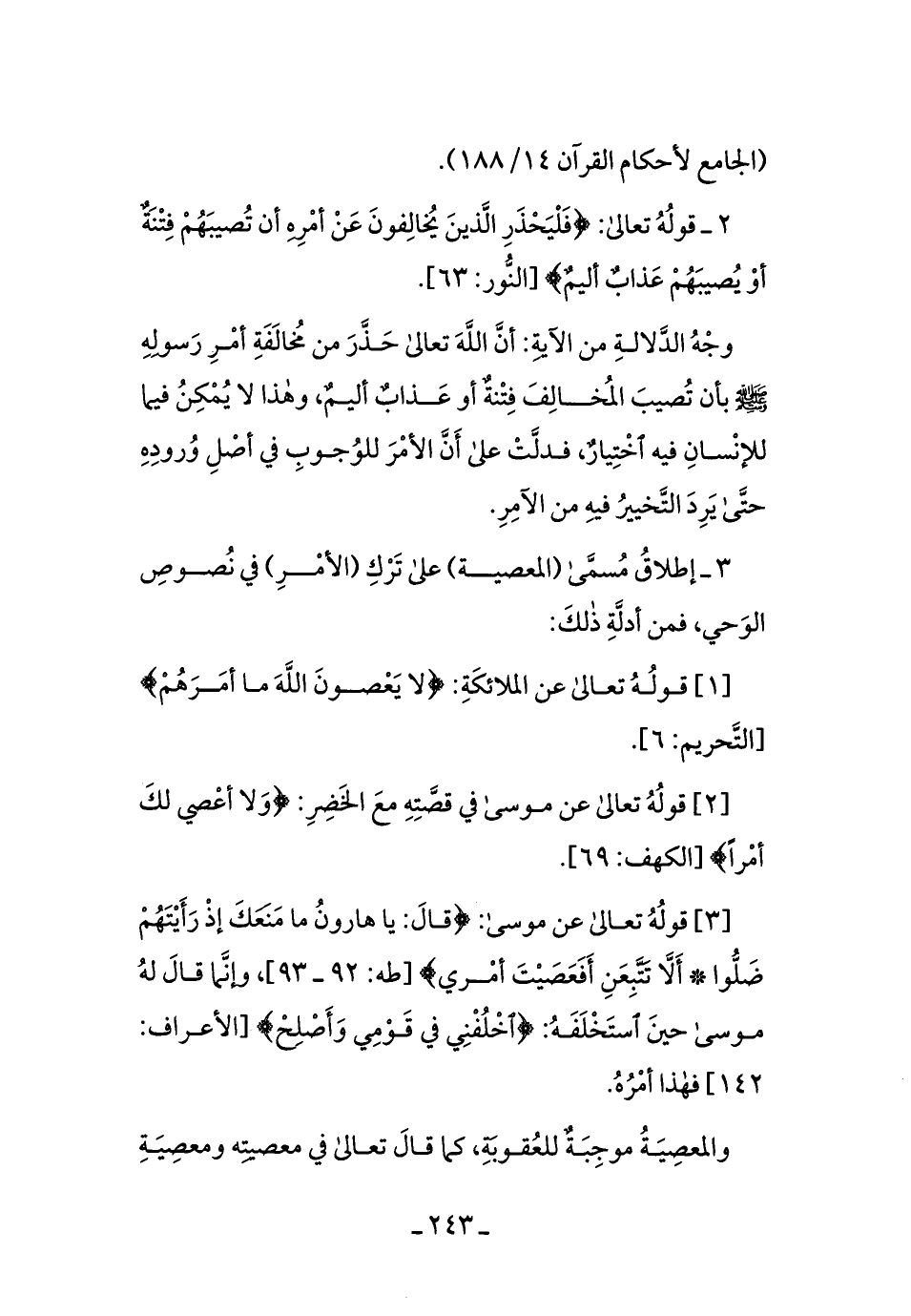 2ـ قوله تعالى: {فَلْيَحْذَرِ الَّذِينَ يُخَالِفُونَ عَنْ أَمْرِهِ أَنْ تُصِيبَهُمْ فِتْنَةٌ أَوْ يُصِيبَهُمْ عَذَابٌ أَلِيمٌ} [النور: 63] .