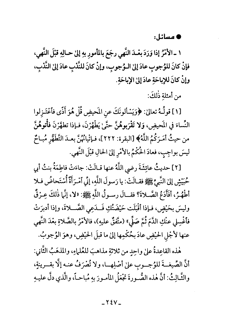 [2] حديثُ عائشةَ رضي الله عنها قالتْ: جاءتْ فاطِمةُ بنتُ أبي حُبيشٍ إلى النَّبيِّ - صلى الله عليه وسلم - فقالتْ: يا رسول الله، إنِّي امرأةٌ أُستحاضُ فلا أطهُرُ، أفأدعُ الصَّلاةَ؟ فقالَ رسول الله - صلى الله عليه وسلم -: ((لا، إنَّما ذلكَ عِرقٌ وليسَ بحيضٍ، فإذا أقبلَتْ حيضتُكِ فدَعِي الصَّلاةَ، وإذا أدبرَتْ فاغسلي عنكِ الدَّمَ ثُمَّ صلِّي)) [متفقٌ عليه] ، فالأمرُ بالصَّلاةِ بعد َالنَّهيِ عنها لأجلِ الحيضِ عادَ بحُكمِهَا إلى ما قبل الحيضِ، وهو الوُجوبُ.
