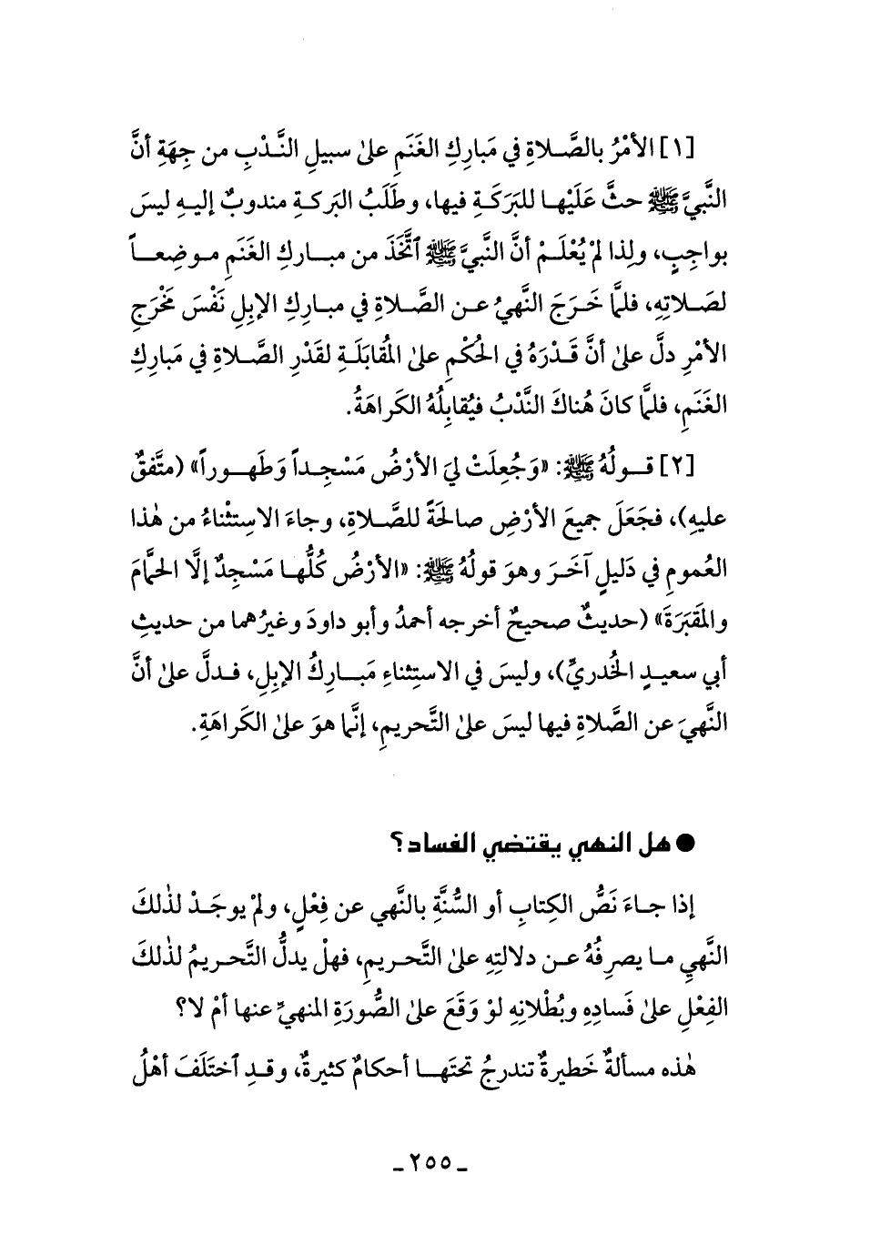 [2] قوله - صلى الله عليه وسلم -: ((وجُعلتْ لي الأرضُ مسجدًا وطهورًا)) [متفقٌ عليه] ، فجعلَ جميعَ الأرضِ صالحةً للصَّلاةِ، وجاءَ الاستثناءًُ من هذا العمومِ في دليلٍ آخرَ وهو قولهُ - صلى الله عليه وسلم -: ((الأرضُ كلُّهَا مسجدٌ إلاَّ الحمَّامَ والمقبرةَ)) [حديثٌ صحيحٌ أخرجه أحمد وأبوداود وغيرهما من حديثِ أبي سعيدٍ الخدُريِّ] ، وليس في الاستثناءِ مباركُ الإبلِ، فدلَّ على أنَّ النَّهيَ عن الصَّلاةِ فيها ليسَ على التَّحريمِ، إنَّما هو على الكراهَةِ.