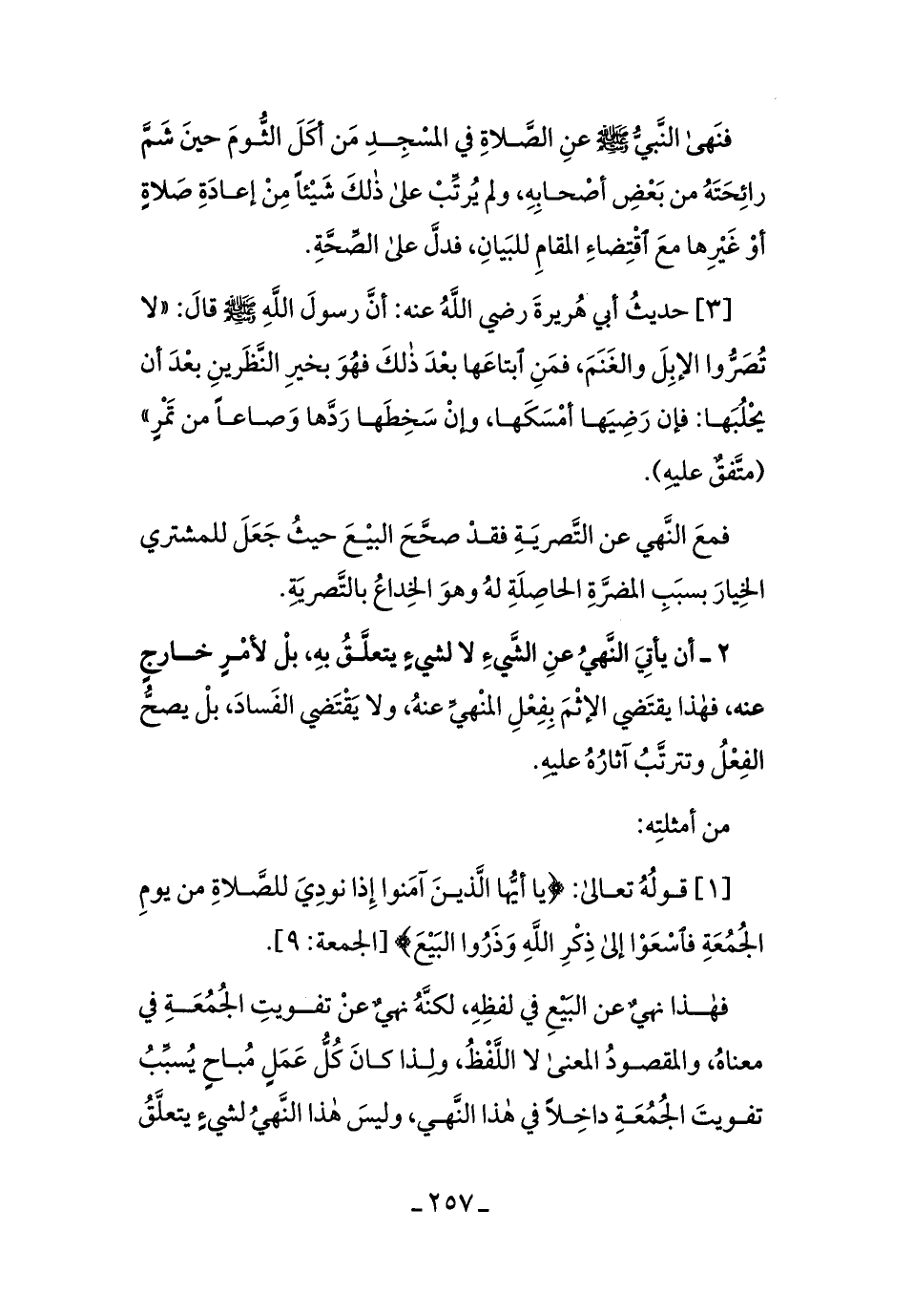[3] حديثُ أبي هُريرةَ رضي الله عنهُ: أنَّ رسول الله - صلى الله عليه وسلم - قالَ: ((لا تُصرُّوا الإبلَ والغَنمَ، فمنِ ابتَاعَها بعدَ ذلكَ فهوَ بخيرِ النَّظرينِ بعدَ أن يَحلبُهَا: فإنْ رضيهَا أمسكَهَا، وإن سخِطهَا ردَّهَا وصاعًا من تمرٍ)) [متفقٌ عليه] .