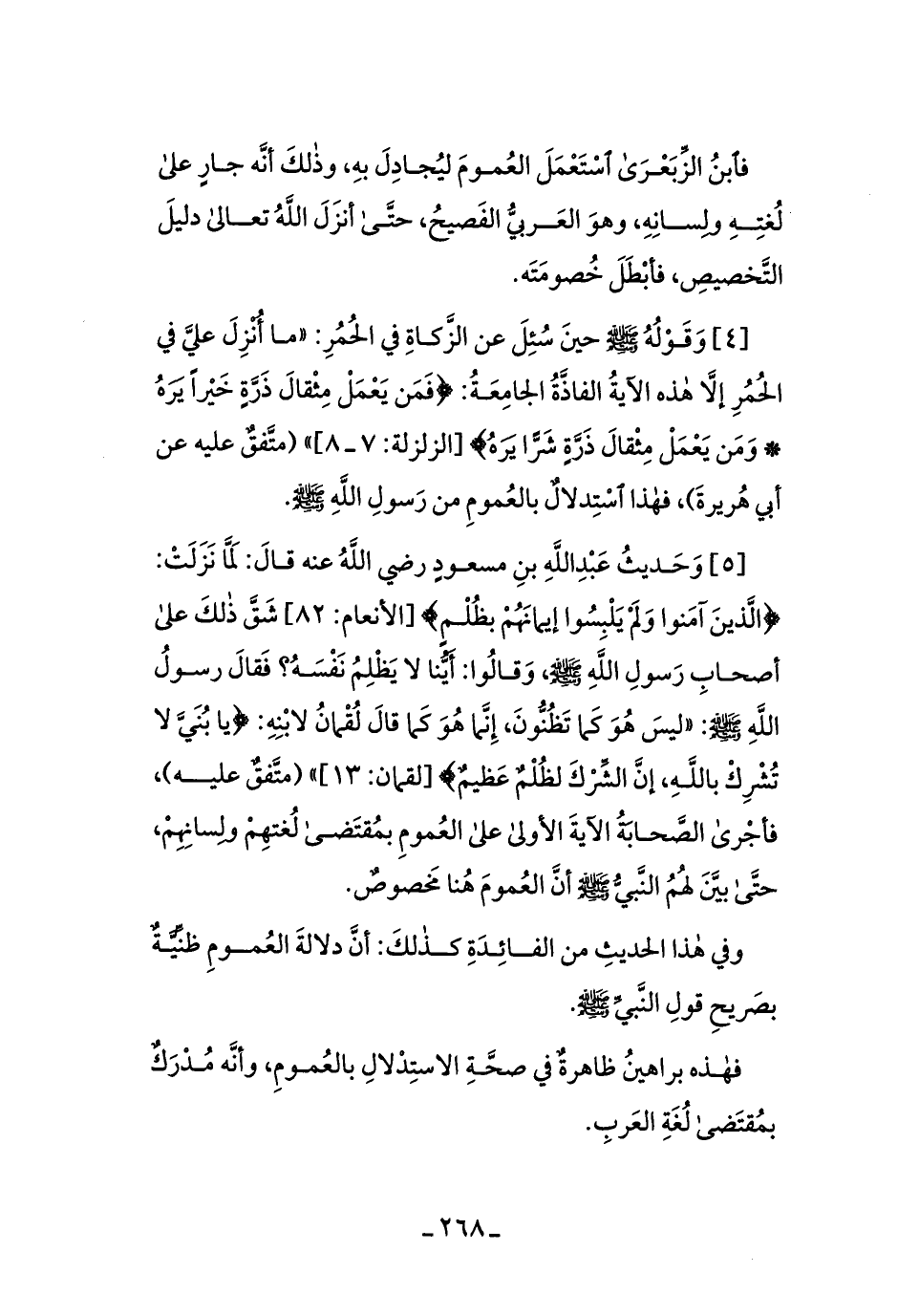 [4] وقوله - صلى الله عليه وسلم - حين سُئلَ عن الزَّكاةِ في الحُمرِ)) ما أُنزل عليَّ في الحمُرِ إلاَّ هذه الآية الفاذّة الجامعةُ: {فَمَنْ يَعْمَلْ مِثْقَالَ ذَرَّةٍ خَيْرًا يَرَهُ (7) وَمَنْ يَعْمَلْ مِثْقَالَ ذَرَّةٍ شَرًّا يَرَهُ} [الزلزلة: 7ـ 8] شقَّ ذلك على أصحابِ رسول الله - صلى الله عليه وسلم -، وقالوا: أيُّنا لا يظلمُ نفسهُ؟ فقال رسول الله - صلى الله عليه وسلم -: ((ليسَ هوَ كما تظنُّونَ، إنَّما هو كما قال لُقمانُ لابنِهِ: {يَا بُنَيَّ لَا تُشْرِكْ بِاللَّهِ إِن الشِّرْكَ لَظُلْمٌ عَظِيمٌ} [لقمان: 13] ، [متفقٌ عليه] ، فأجرى الصَّحابةُ الآية الأولى على العُموم بمقتضى لُغتهم ولسانِهم، حتّى بيَّن لهُم النَّبي - صلى الله عليه وسلم - أنَّ العمومَ هنَا مخصوصٌ.