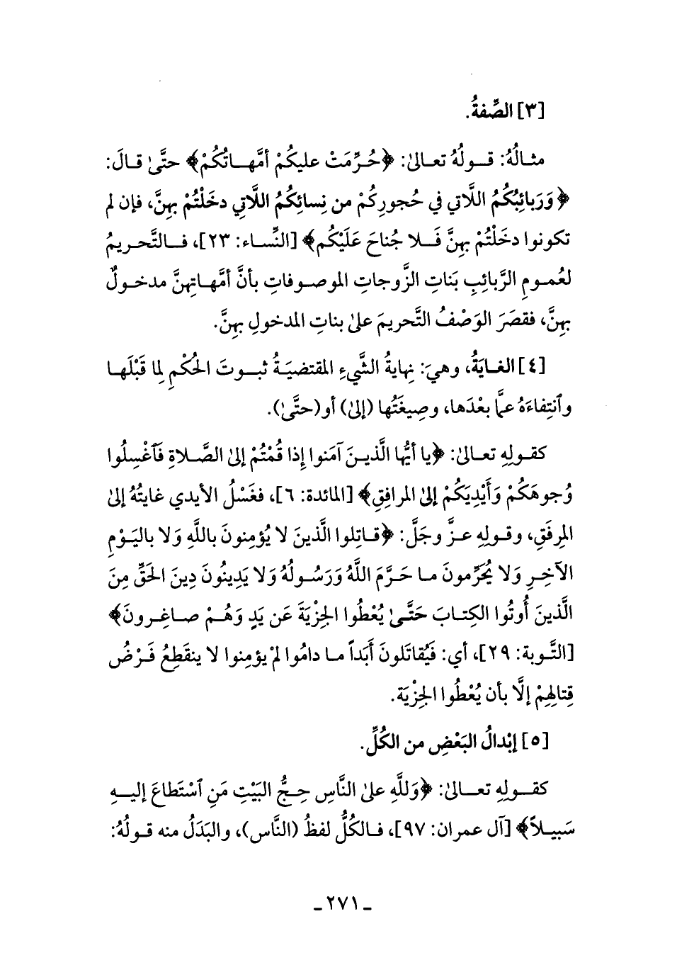 مثالهُ قوله تعالى: {حُرِّمَتْ عَلَيْكُمْ أُمَّهَاتُكُمْ} وَبَنَاتُكُمْ حتى قال: {وَرَبَائِبُكُمُ اللَّاتِي فِي حُجُورِكُمْ مِنْ نسائكم اللَّاتِي دَخَلْتُمْ بِهِنَّ فَإِنْ لَمْ تَكُونُوا دَخَلْتُمْ بِهِنَّ فَلَا جُنَاحَ عَلَيْكُمْ} [النساء: 23] ، فالتَّحريمُ لعمومِ الرَّبائبِ بناتِ الزَّوجاتِ الموصوفاتِ بأنَّ أُمَّهاتهنَّ مدخولٌ بهنَّ، فقصر الوصفُ التَّحريمَ على بناتِ المدخول بهنَّ.