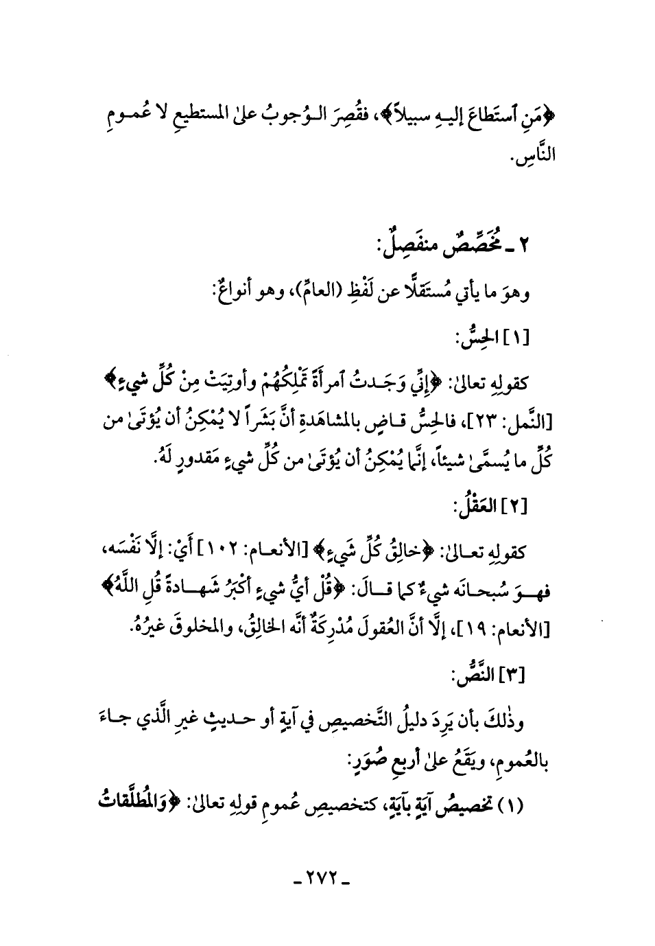 كقوله تعالى: {إِنِّي وَجَدْتُ امْرَأَةً تَمْلِكُهُمْ وَأُوتِيَتْ مِنْ كُلِّ شَيْءٍ} [النمل: 23] ، فالحسُّ قاضٍ بالمشاهَدَةِ أنَّ بشرًا لا يُمكنُ أن يُؤتَى من كلِّ ما يُسمَّى شيئًا، إنَّما يُمكِنُ أن يُؤتَى من كلِّ شيءٍ مقدُورٍ لهُ.