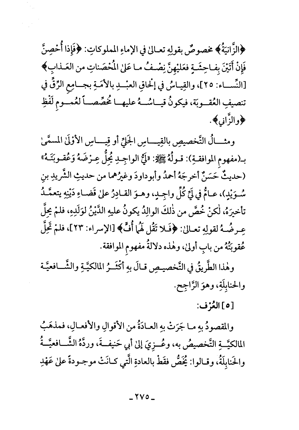 والمقصودُ به ما جرَتْ به العادَةُ من الأقوالِ والأفعالِ، فمذهبُ المالكيَّةِ التَّخصيصُ بهِ، وعُزِيَ إلى أبي حنيفَةَ، وردَّهُ الشَّافعيَّةُ والحنَابِلَةُ، وقالوا يخصُّ فقطْ بالعادَةِ الَّتِي كانتْ موجودَةً على عهدِ