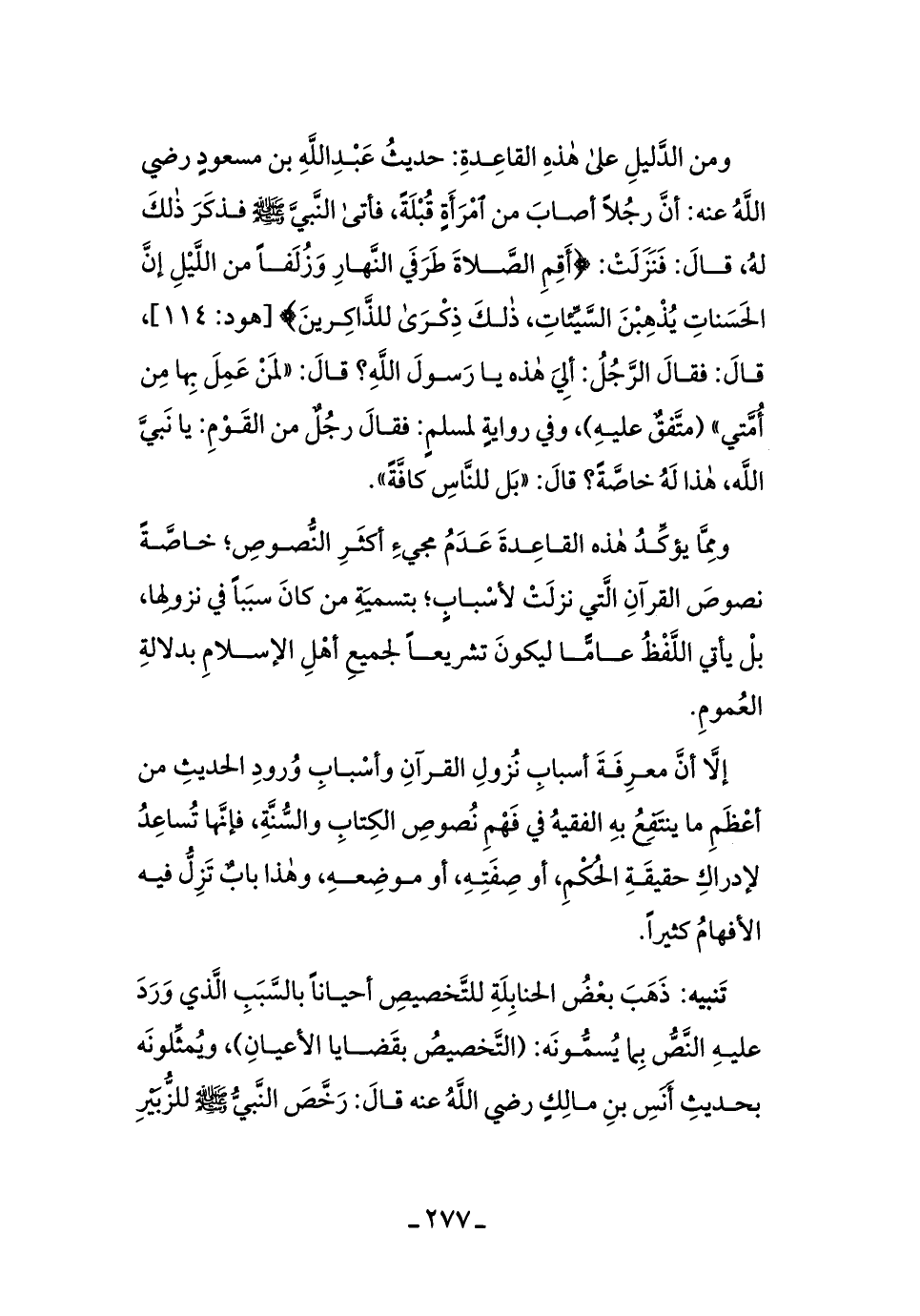 ومن الدَّليل على هذه القاعِدَةِ: حديثُ عبد الله بن مسعودٍ رضي الله عنهُ: أنَّ رجلاً أصابَ من امرأةٍ قُبلَةً، فأتَى النَّبيَّ - صلى الله عليه وسلم - فَذكرَ ذلكَ لهُ، قالَ: فنَزَلتْ: {وَأَقِمِ الصَّلَاةَ طَرَفَيِ النَّهَارِ وَزُلَفًا مِنَ اللَّيْلِ إِنَّ الْحَسَنَاتِ يُذْهِبْنَ السَّيِّئَاتِ ذَلِكَ ذِكْرَى لِلذَّاكِرِينَ} [هود: 114] ، قالَ: فقالَ الرَّلُ: ألِي هذهِ يا رسول الله؟ قالَ: ((لمنْ عملَ بها من أُمَّتي)) [متفقٌ عليه] ، وفي روايةٍ لمسلمٍ: فقالَ رجلٌ من القومِ: يا نبيَّ الله، هذا لهُ خاصَّةً؟ قالَ: ((بلْ للنَّاسِ كافَّةً)) .