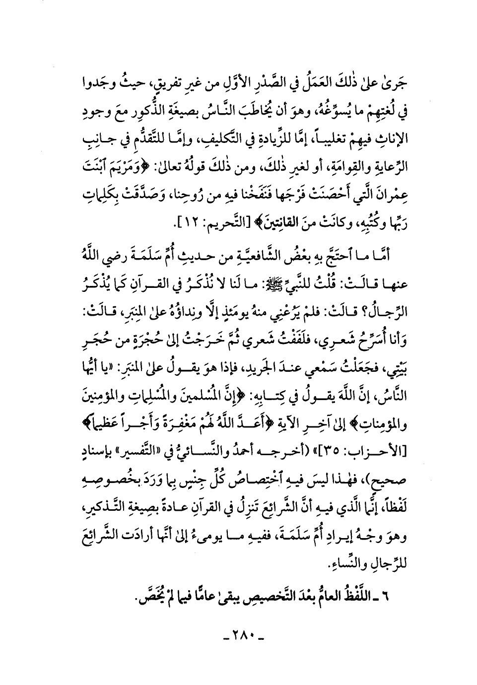 أمَّا ما احتجَّ به بعضُ الشَّافعيَّةِ من حديثِ أمِّ سلمَةَ رضي الله عنها قالتْ: قلتُ للنَّبيِّ - صلى الله عليه وسلم -: ما لنَا لا نُذكرُ في القرآنِ كما يُذكرُ الرِّجالُ؟ قالتْ: فلمْ يرُعْني منهُ يومئذٍ إلاَّ ونِداؤُه على المِنبرِ، قالتْ: وأنا أُسرِّحُ شعري، فلفَفتُ شعري ثمَّ خرجْتُ إلى حُجرَةٍ من حُجرِ بيتي، فجعلتُ سمعِي عندَ الجريدِ، فإذا هوَ يقولُ على المنبرِ: ((يا أيُّها النَّاسُ، إنَّ الله يقولُ في كِتابهِ: {إِنَّ الْمُسْلِمِينَ وَالْمُسْلِمَاتِ وَالْمُؤْمِنِينَ وَالْمُؤْمِنَاتِ} إلى آخرِ الآيةِ {أَعَدَّ اللَّهُ لَهُمْ مَغْفِرَةً وَأَجْرًا عَظِيمًا} [الأحزاب: 35] [أخرجه أحمدُ والنِّسائي في ((التَّفسير)) بإسنادٍ صحيحٍ] ، فهذا ليسَ فيهِ اختصاصُ كلِّ جنسٍ بما وردَ بخُصوصِه لفظًا، إنَّما الَّذي فيه أنَّ الشَّرائِعَ تنزلُ في القرآنِ عادَةً بصيغَةِ التَّذكيرِ، وهوَ وجهُ إيرادِ أمِّ سلمَةَ، ففيهِ ما يوميءُ إلى أنَّها أرادَت الشَّرائِعَ للرِّجالِ والنِّساء.