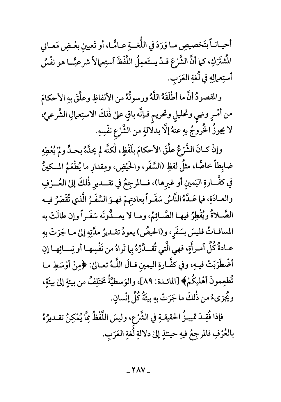 والمقصودُ أنَّ ما أطلقهُ اللهُ ورسولُه من الألفاظِ وعلَّق به الأحكامَ من أمرٍ ونهيٍ وتحليلٍ وتحريمٍ فإنَّه باقٍ على ذلكَ الاستعمالِ الشَّرعيِّ، لا يجوزُ الخُروجُ به عنهُ إلاَّ بدلالةٍ من الشَّرعِ نفسهِ.