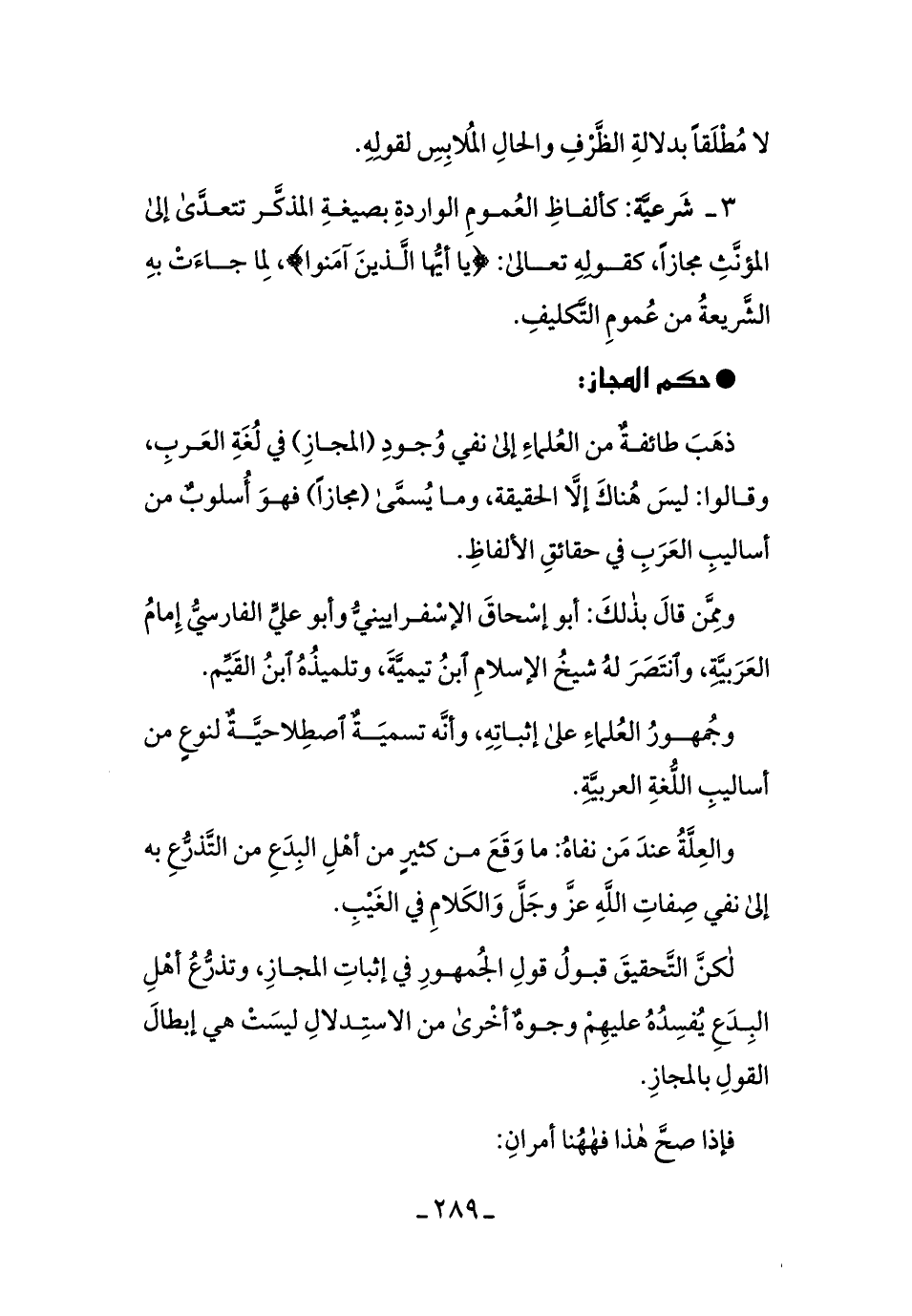 لكنَّ التَّحقيقَ قبولُ قولِ الجُمهورِ في إثباتِ المجازِ، وتذرُّعُ أهلِ البِدعِ يُفسِدُهُ عليهِم وجوهٌ أخرى من الاستِدلالِ ليستْ هي إبطالَ القولِ بالمجازِ.