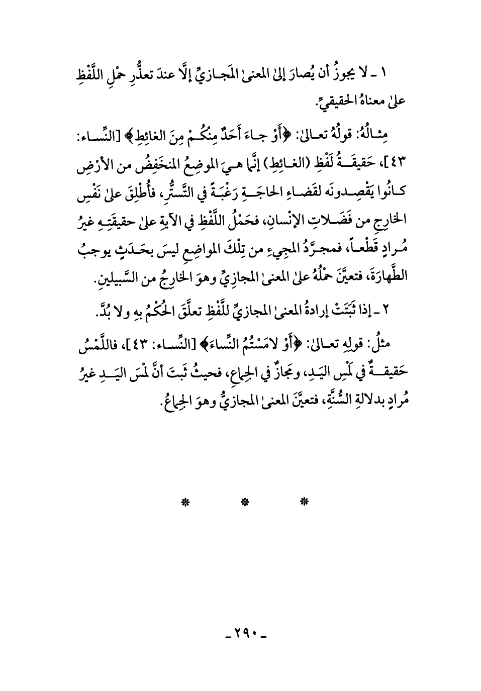 1ـ لا يجوزُ أن يُصار إلى المعنى المجازيِّ إلاَّ عند تعذُّر حملِ اللَّفظِ على معناهُ الحقيقيِّ.