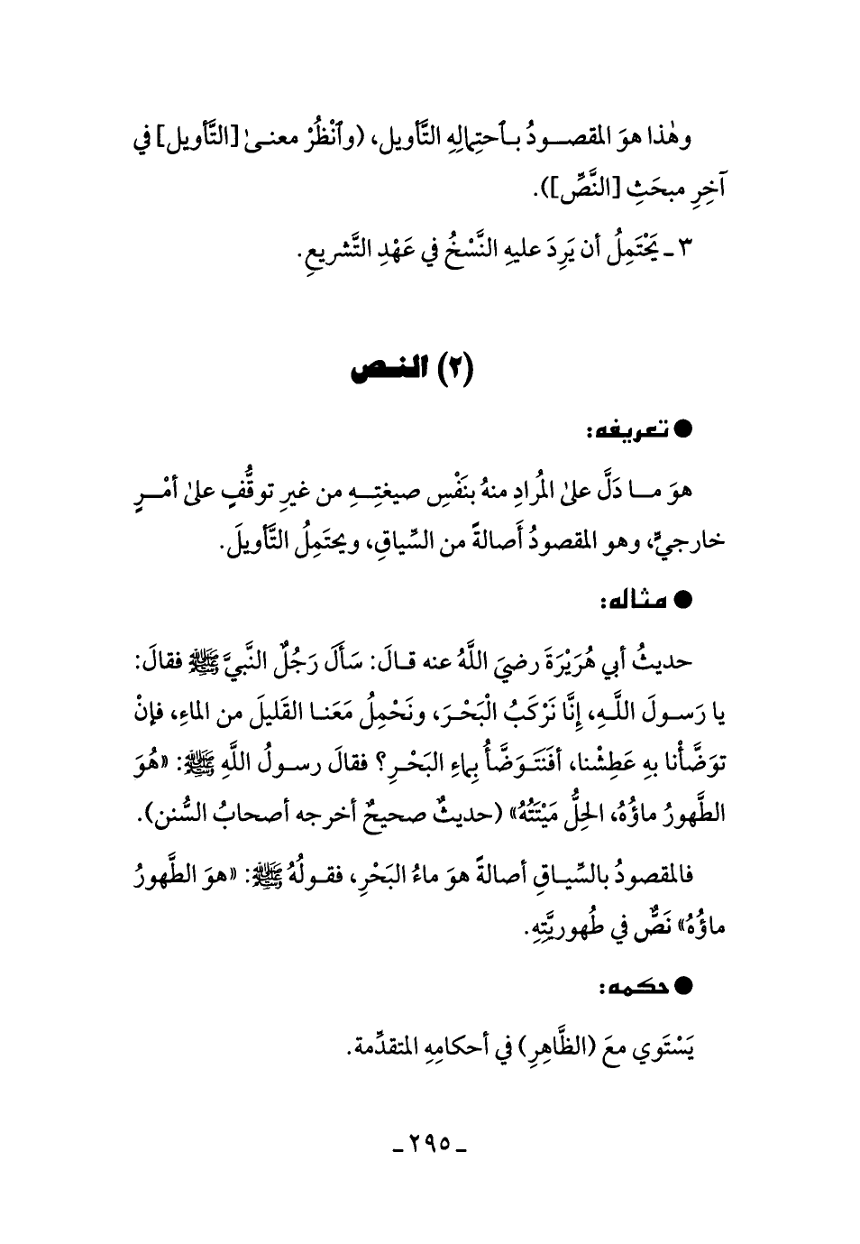هو ما دلَّ على المُرادِ منهُ بنفسِ صيغتِهِ من غيرِ توقُّفٍ علىأمرٍ خارجيٍّ، وهو المقصودُ أصالةً من السِّياقِ، ويحتملُ التَّأويلَ.