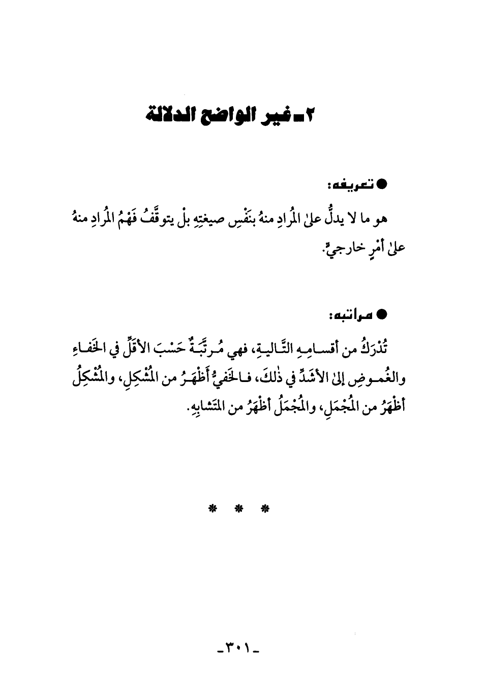 تُدركُ من أقسامِه التَّاليَّةِ، فهيَ مُرتَّبةٌ حسبَ الأقلِّ في الخفاءِ والغُموضِ إلى الأشَدِّ في ذلكَ، فالخفيُّ أظهرُ من المُشكلِ، والمُشكِلُ أظهرُ من المُجملِ، والمُجملُ أظهرُ من المُتشابهِ.