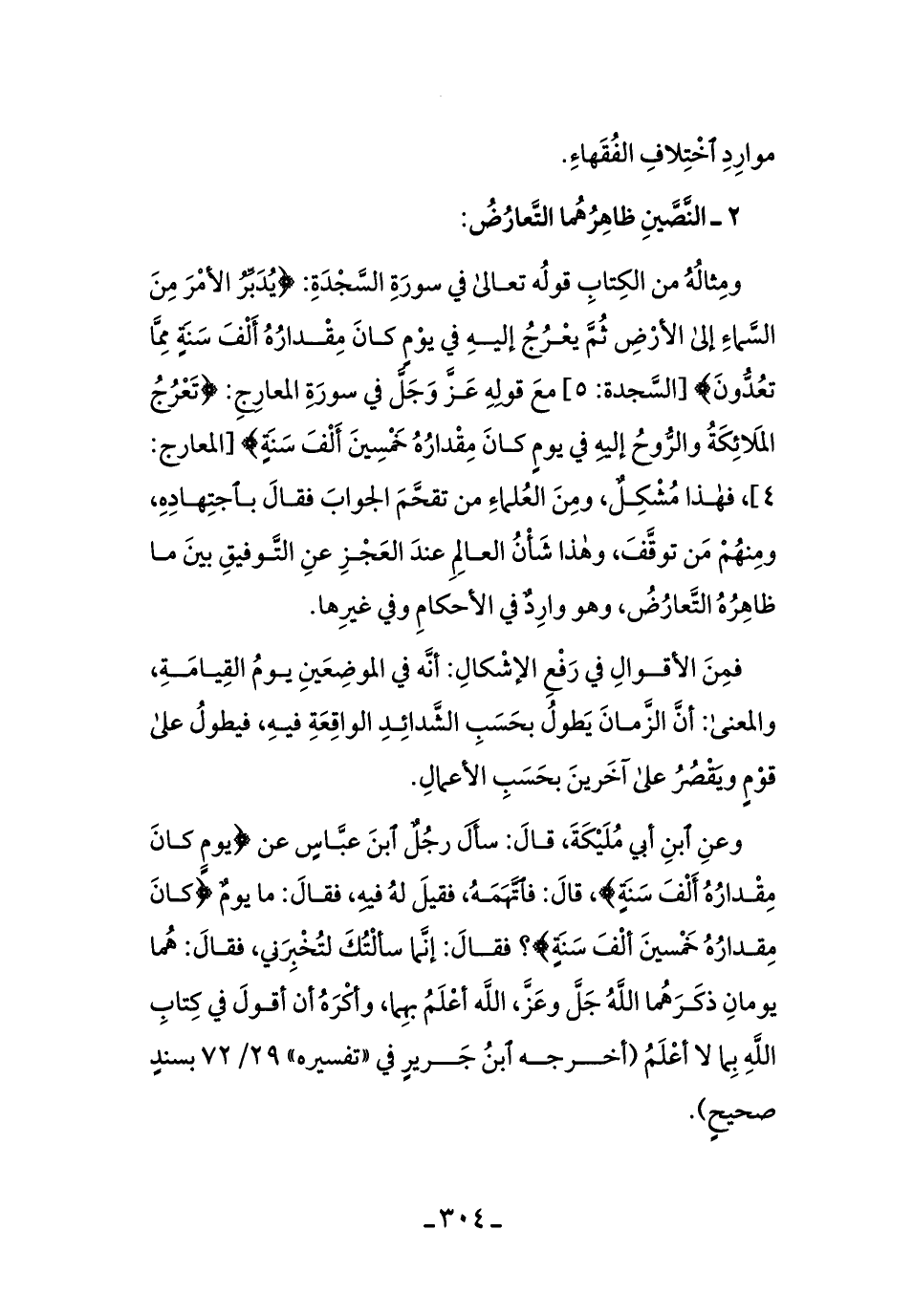 ومثالُه من الكتابِ قولهُ تعالى في سورةِ السَّجدَةِ: {يُدَبِّرُ الْأَمْرَ مِنَ السَّمَاءِ إِلَى الْأَرْضِ ثُمَّ يَعْرُجُ إِلَيْهِ فِي يَوْمٍ كَانَ مِقْدَارُهُ أَلْفَ سَنَةٍ مِمَّا تَعُدُّونَ} [السجدة: 5] مع قولِهِ عزَّوجلَّ في سورةِ المعارجِ {تَعْرُجُ الْمَلَائِكَةُ وَالرُّوحُ إِلَيْهِ فِي يَوْمٍ كَانَ مِقْدَارُهُ خَمْسِينَ أَلْفَ سَنَةٍ} [المعارج: 4] ، فهذا مُشكلٌ، ومنَ العُلماءِ من تقحَّم الجوابَ فقالَ باجتِهادِهِ، ومنهُم من توقَّفَ، وهذا شأنُ العالمِ عندَ العَجزِ عن التَّوفيقِ بينَ ما ظاهرُهُ التَّعارضُ، وهو واردٌ في الأحكامِ وفي غيرِهَا.