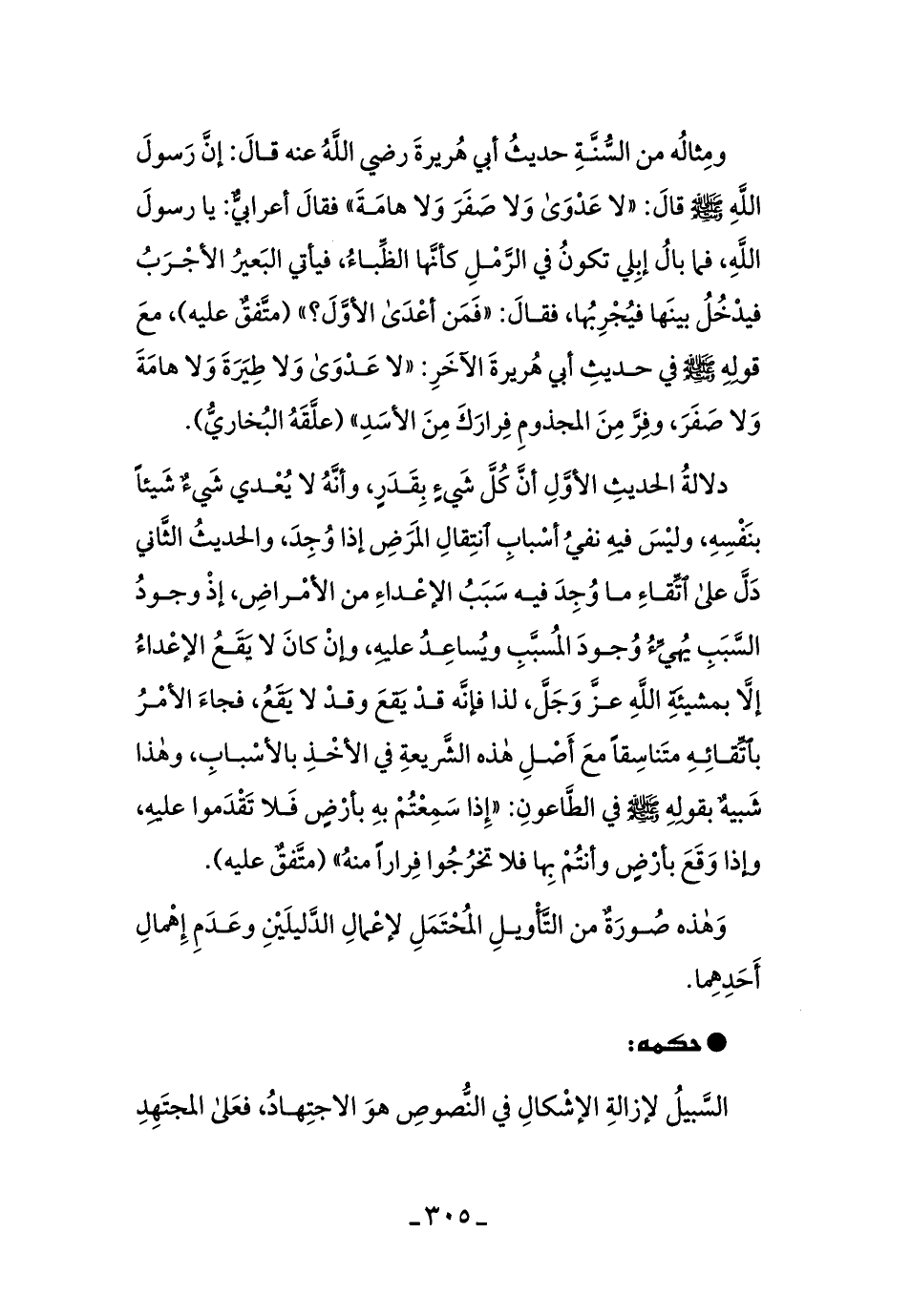 ومثالُه من السُّنَّةِ حديثُ أبي هريرَةَ رضي الله عنه قالَ: إنَّ رسولَ الله - صلى الله عليه وسلم - قالَ: ((لا عَدوَى ولا صفرَ ولا هامَّةَ)) فقال أعرابيٌّ: يا رسول الله، فما بالُ إبلِي تكونُ في الرَّملِ كأنَّها الظِّباءُ، فيأتي البعيرُ الأجرَبُ فيدخُل بينهَا فيُجربُهَا، فقال: ((فمن أعدَى الأوَّلَ؟)) [متفقٌ عليه] ، معَ قولهِ - صلى الله عليه وسلم - في حديثِ أبي هريرةَ الآخرِ: ((لاعدوى ولا طِيرةَ ولا هامَةَ ولا صفرَ، وفرَّ من المجذُومِ فِرَارَك من الأسدِ)) [علَّقهُ البُخاريُّ] .
