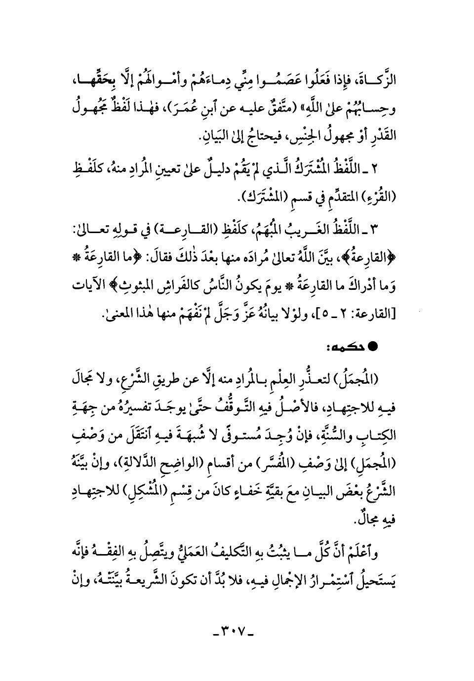 الزَّكاةَ، فإذا فعلُوا عصمُوا منِّي دِماءَهُمْ وأموالَهُم إلاَّ بحقِّهَا وحسابُهُم على الله)) [متفقٌ عليه عن ابنِ عُمرَ] ، فهذا لفظٌ مجهولُ القَدرِ أو مجهُولُ الجِنسِ، فيحتاجُ إلى البيانِ.