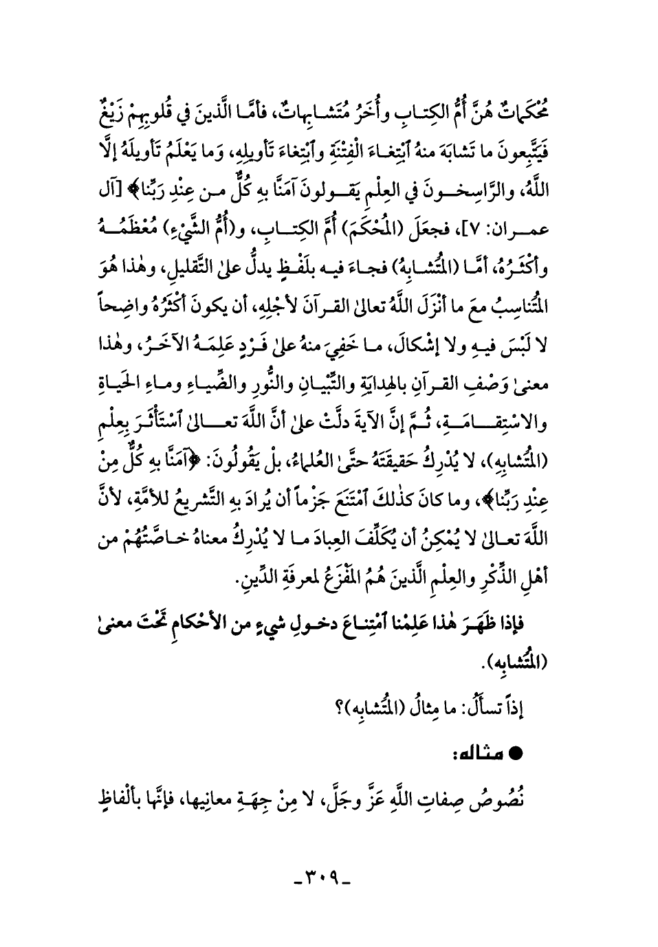 مُحْكَمَاتٌ هُنَّ أُمُّ الْكِتَابِ وَأُخَرُ مُتَشَابِهَاتٌ فَأَمَّا الَّذِينَ فِي قُلُوبِهِمْ زَيْغٌ فَيَتَّبِعُونَ مَا تَشَابَهَ مِنْهُ ابْتِغَاءَ الْفِتْنَةِ وَابْتِغَاءَ تَأْوِيلِهِ وَمَا يَعْلَمُ تَأْوِيلَهُ إِلَّا اللَّهُ وَالرَّاسِخُونَ فِي الْعِلْمِ يَقُولُونَ آَمَنَّا بِهِ كُلٌّ مِنْ عِنْدِ رَبِّنَا} [آل عمران: 7] ، فجعلَ (المُحكمَ) أُمَّ الكتابِ، و (أُمُّ الشَّيءِ) مُعظمهُ وأكثرُهُ، أمَّا (المُتشابه) فجاء فيه بلفظٍ يدلُّ على التَّقليلِ، وهذا هو المُتناسبُ مع ما أنزل الله تعالى القرآنَ لأجلِهِ، أن يكونَ أكثرُهُ واضحًا لا لبسَ فيه ولا إشكالَ، ما خفِي منهُ على فردٍ علِمهُ الآخرُ، وهذا معنى وصفِ القرآنِ بالهدايَةِ والتِّبيانِ والنُّورِ والضِّياء وماءِ الحياةِ والاستِقامَةِ، ثمَّ إنَّ الآية دلَّت على أنَّ الله تعالى استأْثرَ بِعلمِ (المُتشابه) ، لا يُدركُ حقيقتهُ حتَّى العُلماءُ، بلْ يقولُونَ: {آَمَنَّا بِهِ كُلٌّ مِنْ عِنْدِ رَبِّنَا} ، وما كانَ كذلكَ امتنعَ جزمًا أنْ يرادَ به التَّشريعُ للأمَّةِ، لأنَّ الله تعالى لا يُمكنُ أن يُكلِّفَ العِبادَ ما لا يُدركُ معناهُ خاصَّتُهُم من أهلِ الذِّكرِ والعلمِ الَّذين هُمُ المفزَعُ لمعرفةِ الدِّينِ.