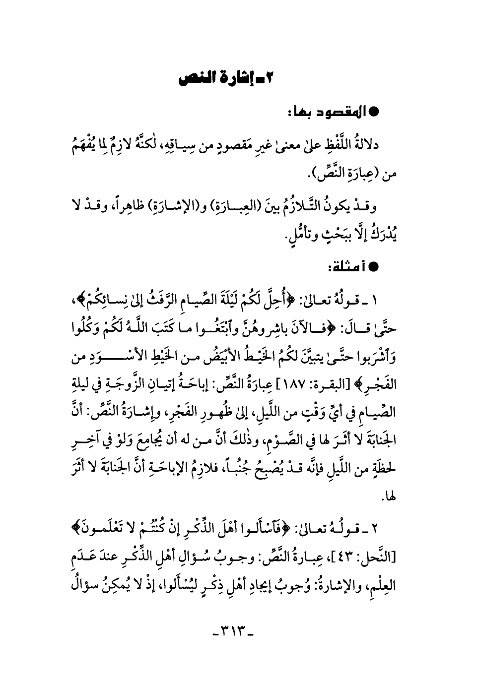 2ـ قوله تعالى: {فَاسْأَلُوا أَهْلَ الذِّكْرِ إِنْ كُنْتُمْ لَا تَعْلَمُونَ} [النحل: 43] عبارَةُ النَّصِّ: وُجوبُ سُؤالِ أهلِ الذِّكرِ عندَ عدَمِ العِلمِ، والإشارَةُ: وُجوبُ إيجادِ أهلِ ذِكرِ لِيُسألُوا، إذْ لا يُمكنُ سُؤالُ