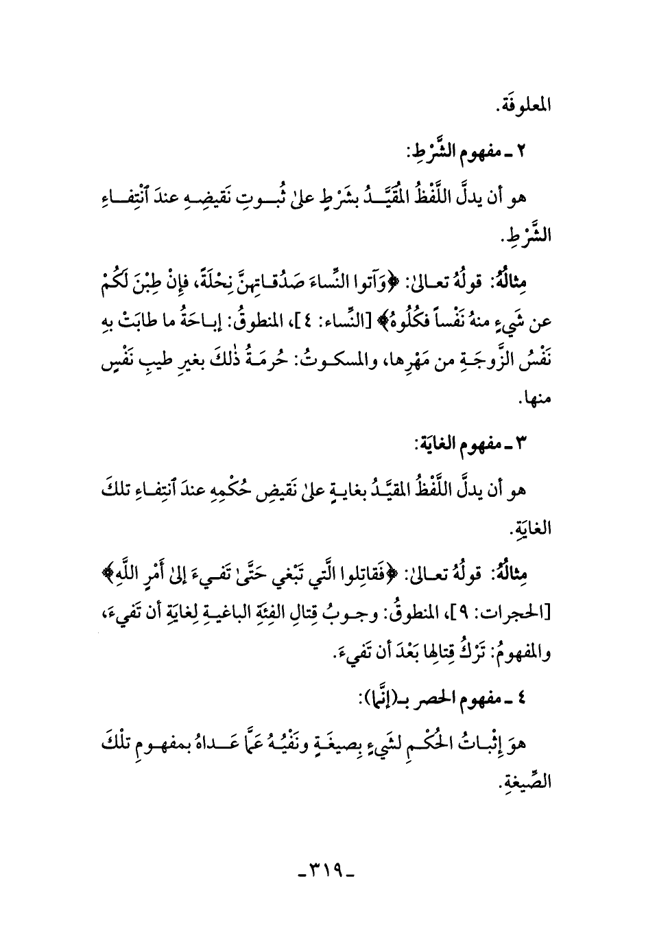 مثالهُ: قوله تعالى: {فَقَاتِلُوا الَّتِي تَبْغِي حَتَّى تَفِيءَ إِلَى أَمْرِ اللَّهِ} [الحجرات: 9] ، المنطوقُ: وجوبُ قتالِ الفِئةِ الباغيَةِ لغايةِ أن تفيءَ، والمفهومُ: تركُ قتالِهَا بعدَ أن تفيءَ.