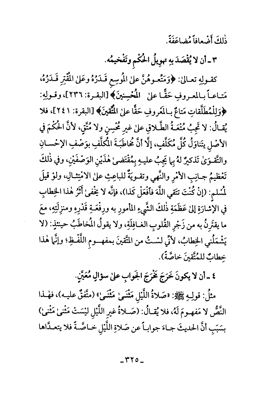 كقوله تعالى: {وَمَتِّعُوهُنَّ عَلَى الْمُوسِعِ قَدَرُهُ وَعَلَى الْمُقْتِرِ قَدَرُهُ مَتَاعًا بِالْمَعْرُوفِ حَقًّا عَلَى الْمُحْسِنِينَ} [البقرة: 236] ، وقوله: {وَلِلْمُطَلَّقَاتِ مَتَاعٌ بِالْمَعْرُوفِ حَقًّا عَلَى الْمُتَّقِينَ} [البقرة: 241] ، فلا يُقالُ: لا تجبُ مُتعة الطَّلاقِ على غيرِ مُحسنٍ ولا متَّقٍ، لأنَّ الحكم في الأصلِ يتناولُ كُلَّ مكلَّفٍ، إلاَّ أنَّ مخاطبةَ المكلَّفِ بوصفِ الإحسانِ والتَّقوى تذكيرٌ له بما يجبُ عليه بمقتضَى هذينِ الوصفينِ، وفي ذلكَ تعظيمُ جانبِ الأمرِ والنَّهي وتقويةٌ للباعثِ على الامتِثالِ، ولو قيلَ لمسلمٍ: (إن كنتَ تتَّقي الله فافْعلْ كذا) ، فإنَّه لا يخفى أثرُ هذا الخطابِ في الإشارَةِ إلى عظمةِ ذلك الشَّيء المأمورِ به ورفعَةِ قدْرِه ومنزلتِه، مع ما يقترنُ به من زجرِ القُلوبِ الغافلةِ، ولا يقولُ المخاطبُ حينئذٍ: (لا يشملُني الخِطابُ، لأنِّي لستُ من المتَّقينَ بمفهُومِ اللَّفظِ؛ وإنَّما هذا خِطابٌ للمتَّقينَ خاصَّةً) .