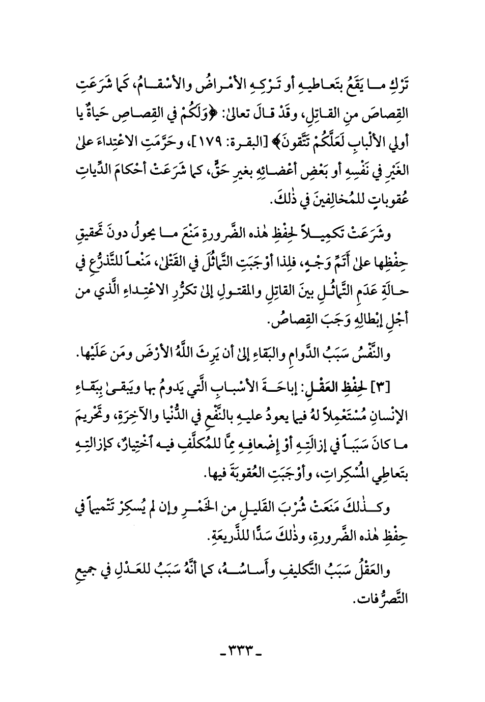 [3] لحفظِ العقلِ: إباحَةَ الأسبابِ الَّتي يدومُ بها ويبقى ببقاءِ الإنسانِ مستعملاً له فيما يعودُ عليهِ بالنَّفعِ في الدُّنيَا والآخرَةِ، وتحريمَ ما كانَ سببًا في إزالتِهِ أو إضعَافِه ممَّا للمكلَّفِ فيهِ اختيارٌ، كإزالتِه بتعاطي المُسكرَاتِ، وأوجبَتِ العُقوبةَ فيهَا.
